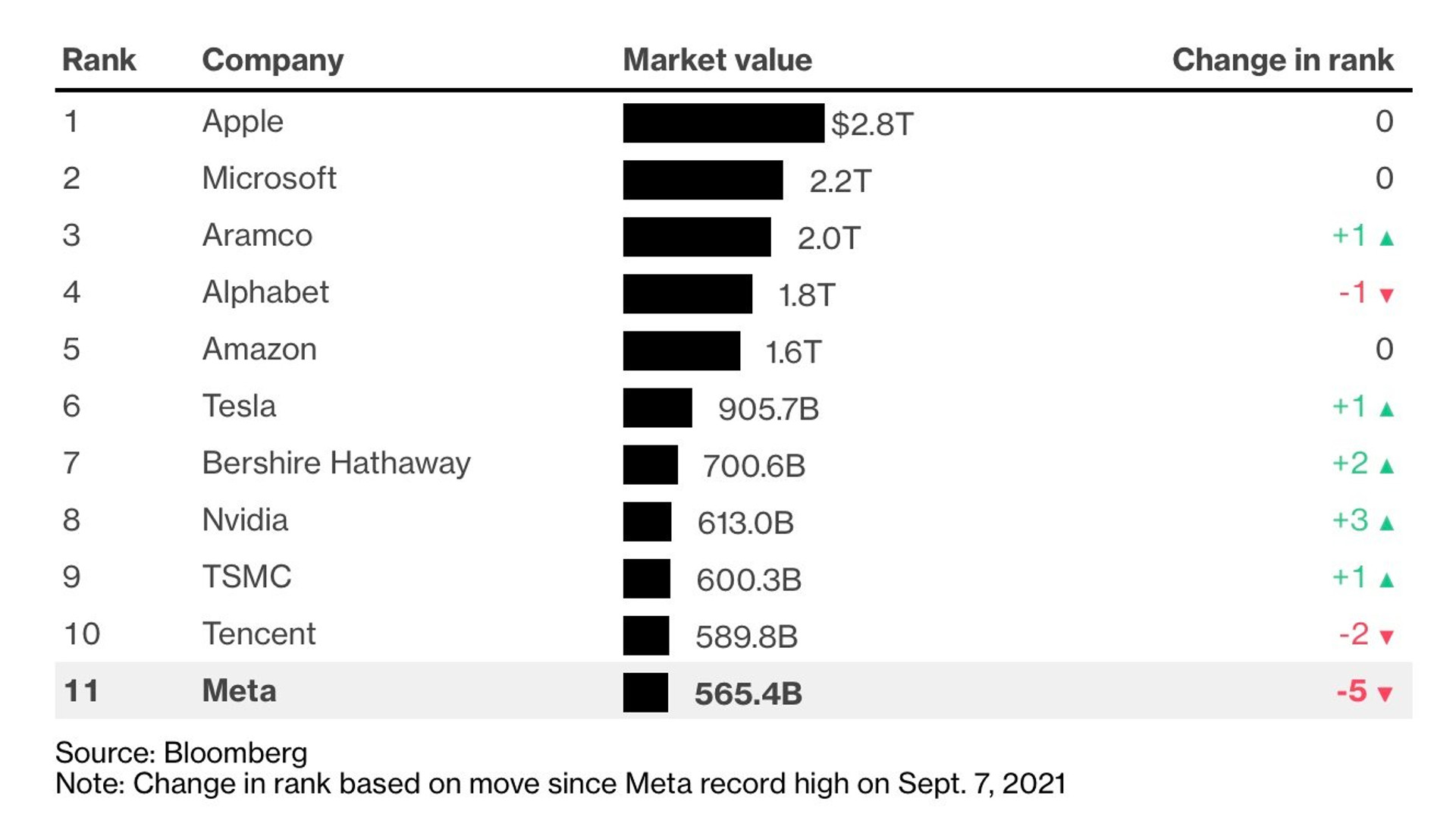 Колись шоста за величиною компанія у світі з вартістю понад $1 трильйон, материнська компанія Facebook в четвер завершила торги із вартістю $565 мільярдів, що помістило її на 11 місце після Tencent Holdings, згідно з даними, зібраними Bloomberg.