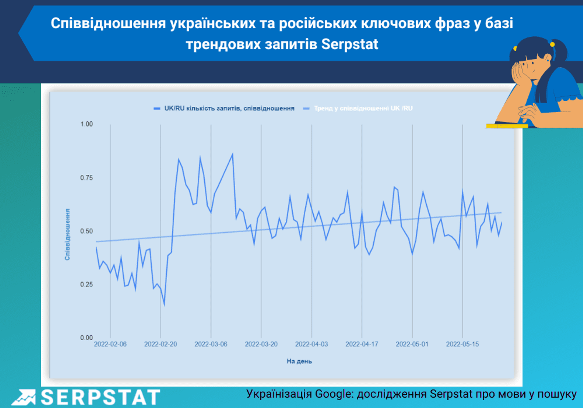 Якщо розглянути щоденне співвідношення запитів українською та російською, то тренд виглядає так:
