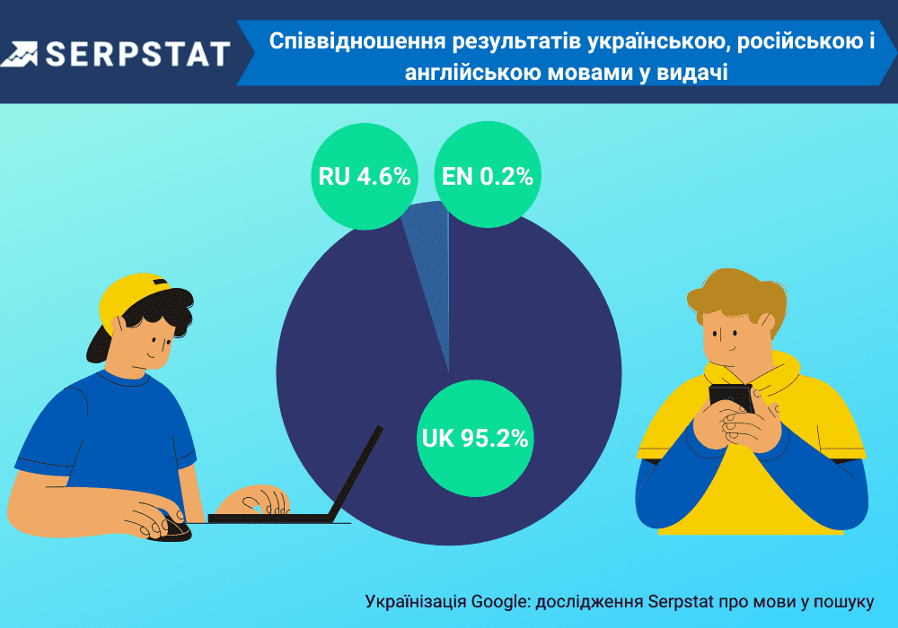 Таким чином кількість запитів українською зросла від 26% до 35%. Більшість українців все ще гуглять російською, однак україномовна частка неухильно зростає.