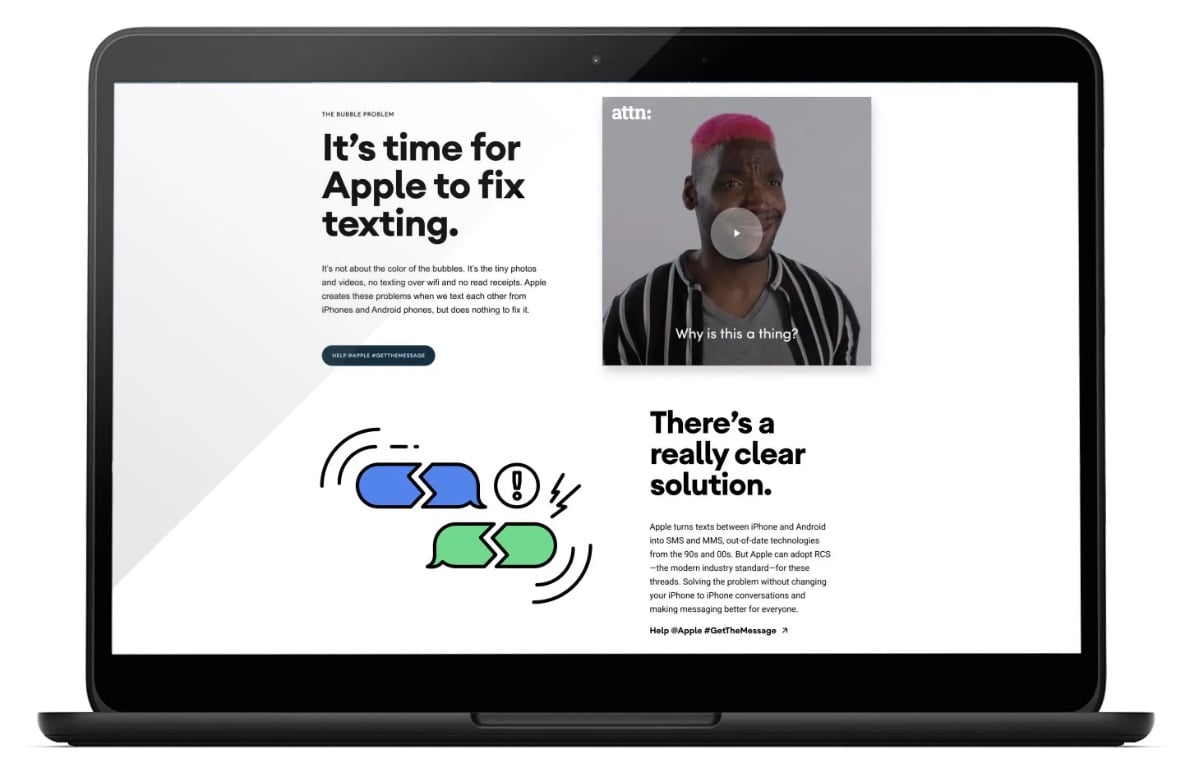 «Настав час для Apple виправити обмін повідомленнями. Справа не в кольорі бульбашок. Це розмиті відео, розірвані групові чати, відсутність сповіщень про прочитання та індикаторів набору тексту, неможливість переписки через Wi-Fi тощо. Ці проблеми існують тому, що Apple відмовляється впровадити сучасні стандарти для обміну повідомленнями, коли люди з iPhone та Android пишуть одне одному», – йдеться на сторінці кампанії.