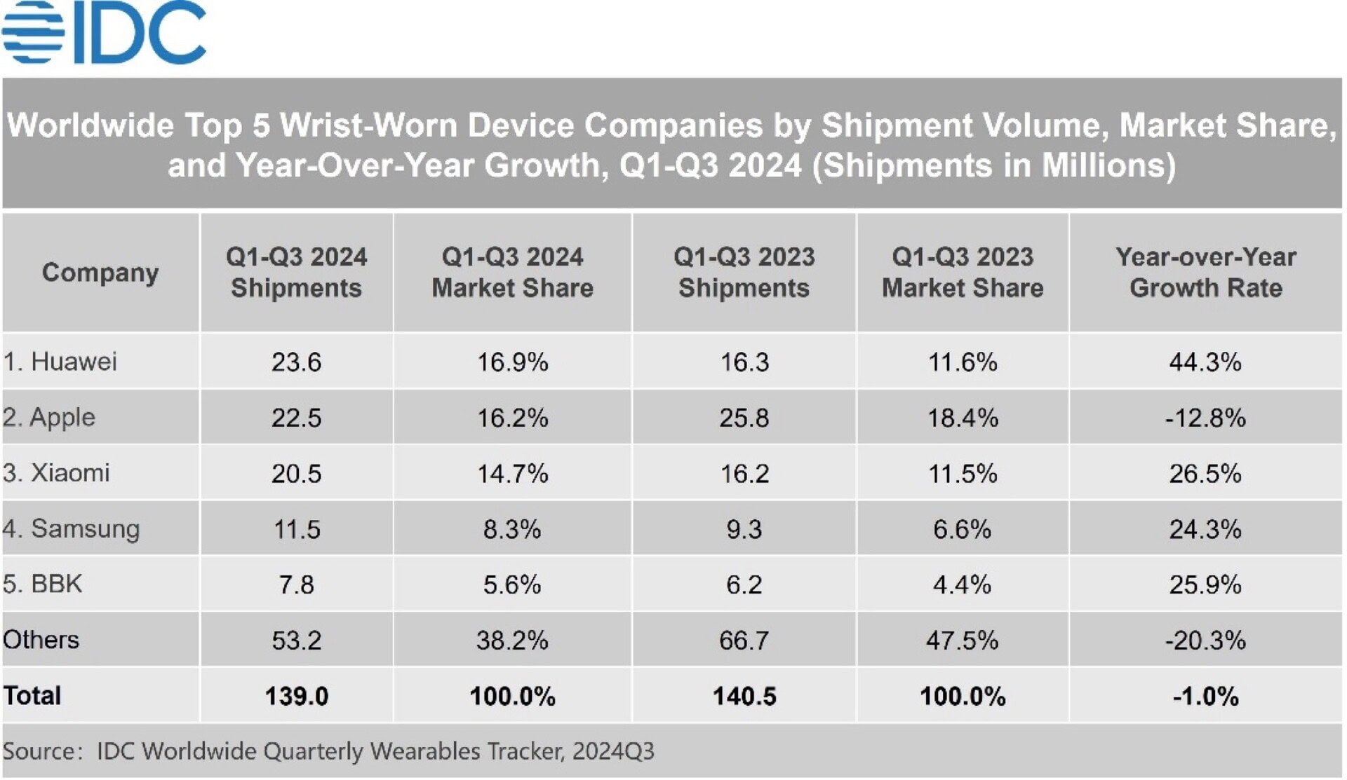Xiaomi займає третє місце на ринку зі 20,5 мільйонами продажів і часткою 14,7%. Це завдяки популярності Xiaomi Smart Band 9, а також дорожчому смартгодиннику Xiaomi Watch S4, який сприяв зростанню продажів на 26,5%.