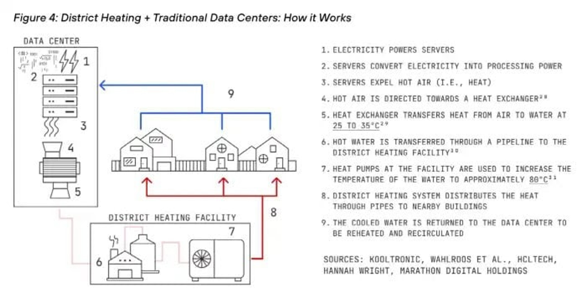 MARA також раніше пояснила, як саме працює цей проєкт. Гаряче повітря, яке виділяють сервери для майнінгу, направляють до теплообмінника, який перенаправляє тепло з повітря у воду при 25-35°C. Після цього гаряча вода подається по трубопроводу у центр теплопостачання, де теплові насоси підвищують температуру до 80°C. Далі тепло постачають у будинки, а охолоджену воду повертають до центрів обробки даних, де її заново нагрівають.