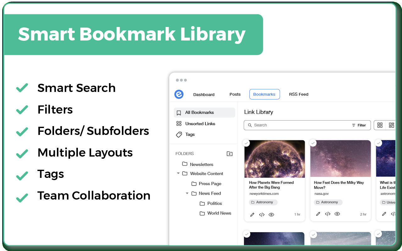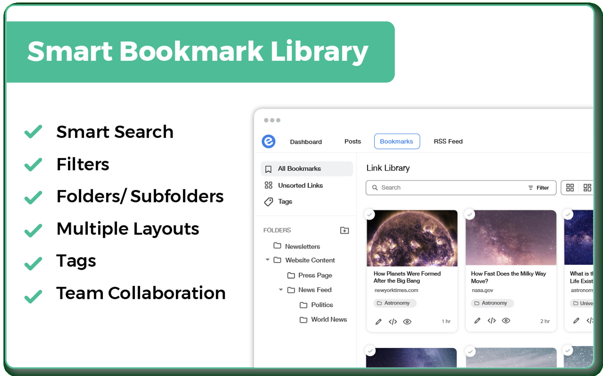 Розширення elink bookmark для Chrome – це інструмент для збереження та упорядкування візуальних закладок в одному місці. Зберігаючи закладку або посилання, можна вибрати зображення, зробити знімок екрана або завантажити власне зображення. Окрім цього, є можливість редагувати назву та опис, додавати власні коментарі або нотатки, а також об'єднувати посилання в пакети та ділитися своєю колекцією посилань з іншими.