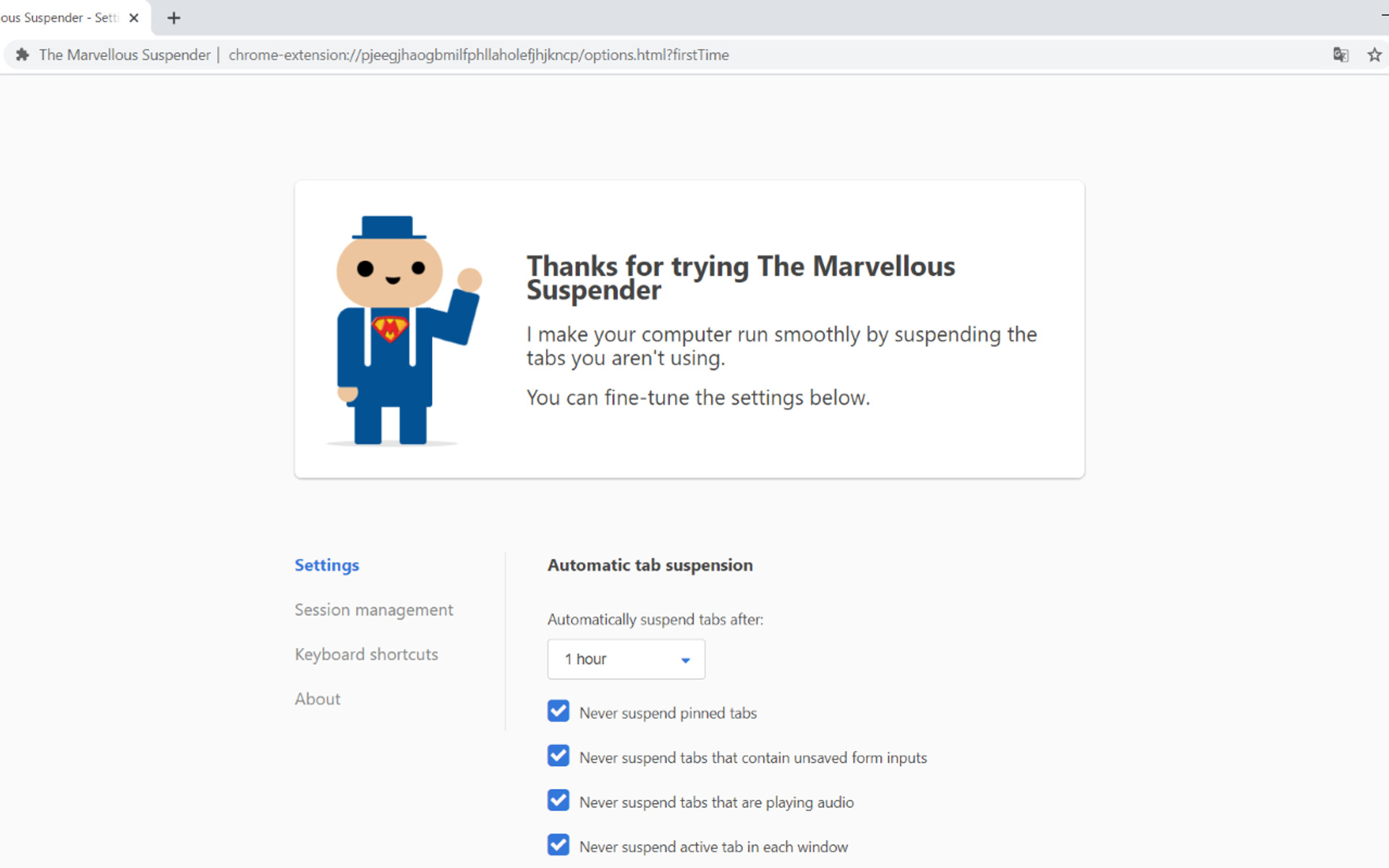Безпечна fork-версія The Great Suspender — без сторонніх трекерів і з повною прозорістю. Плагін автоматично призупиняє неактивні вкладки після заданого часу, знижуючи навантаження на оперативну пам’ять. Призначений для користувачів, які відкривають десятки вкладок щодня. В додатку присутня можливість виключення певних сайтів із "suspend"-процесу і ручне "оживлення" вкладок.