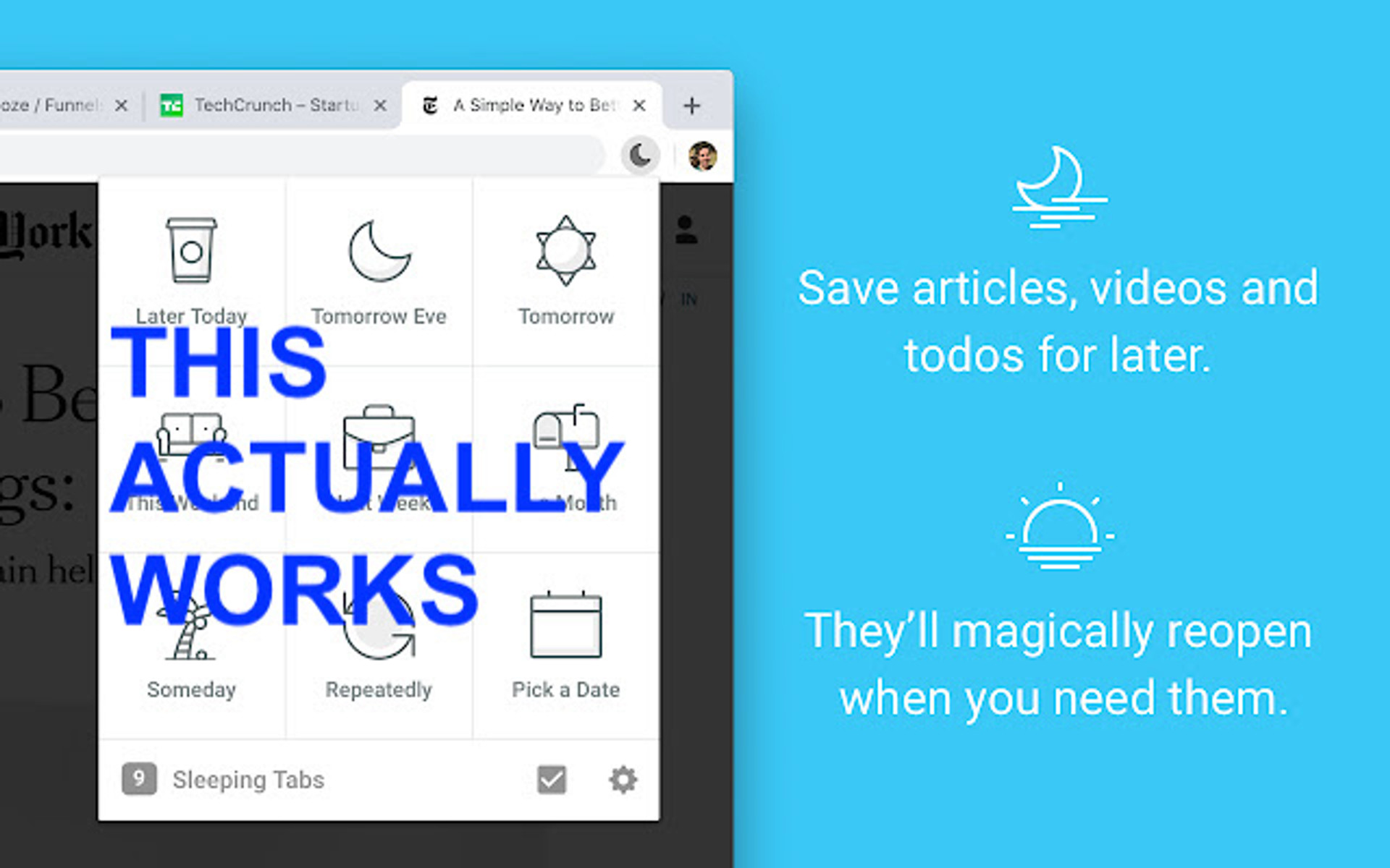 Плагін дозволяє "усипити" вкладки до певного часу чи дати. Наприклад, якщо ви плануєте прочитати статтю ввечері — просто встановіть таймер, і вкладка автоматично повернеться, коли вам потрібно. Вкладки зберігаються у нагадуваннях, тож у браузері лишається лише те, що дійсно актуально. Добре поєднується з To-Do-підходом до вкладок.