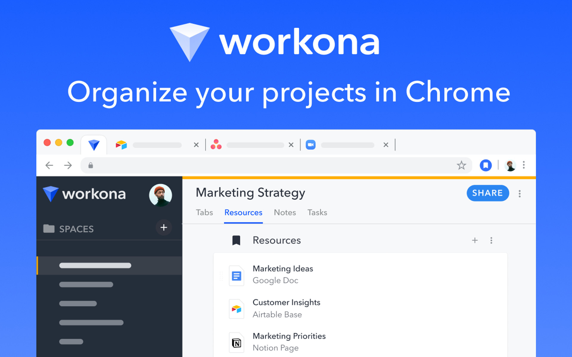 Створює окремі простори для завдань — наприклад, "робота", "навчання", "особисті справи", що допомагає уникнути хаосу вкладок і фокусовано перемикатися між контекстами. Кожна сесія автоматично зберігається, а резервні копії дозволяють відновити вкладки після збою чи закриття браузера. Унікальна функція — "tab suspension", завдяки якій Workona призупиняє неактивні вкладки, значно зменшуючи споживання пам’яті комп’ютером й підвищуючи швидкість роботи браузера.