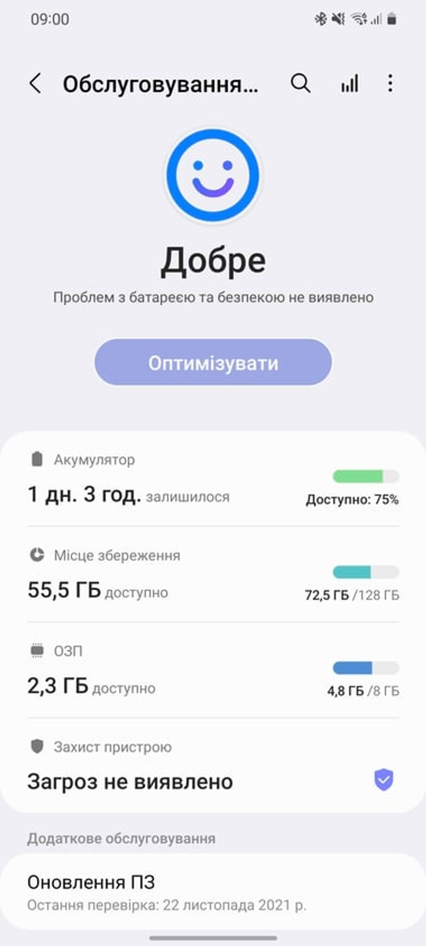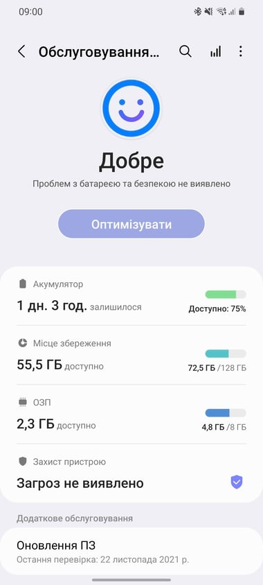 В налаштуваннях One U 4 візуально оновили розділ «Батарея та обслуговування пристрою», який тепер замість оцінки стану смартфона від 0 до 100 балів показується смайл і прописується стан системи та акумулятора.