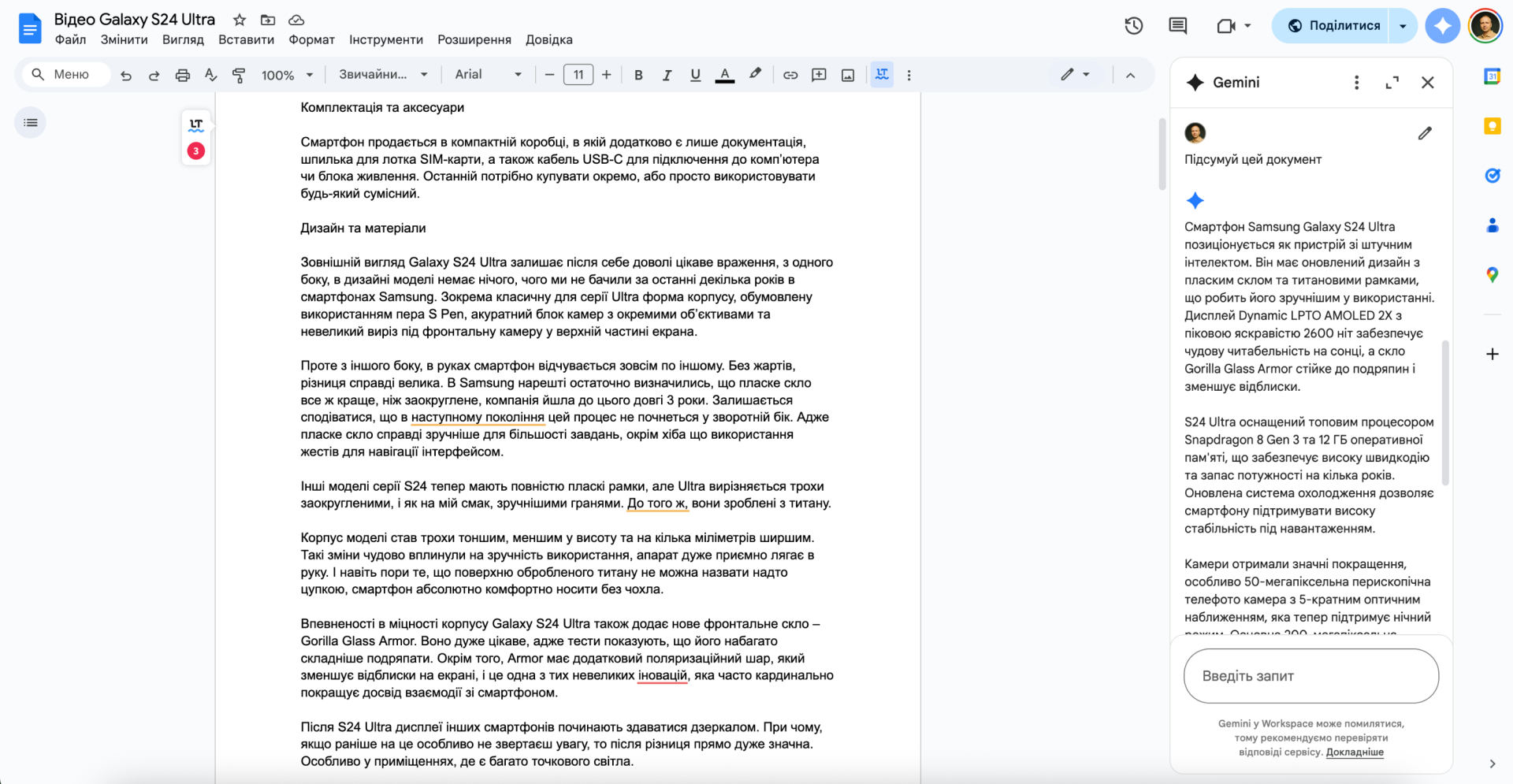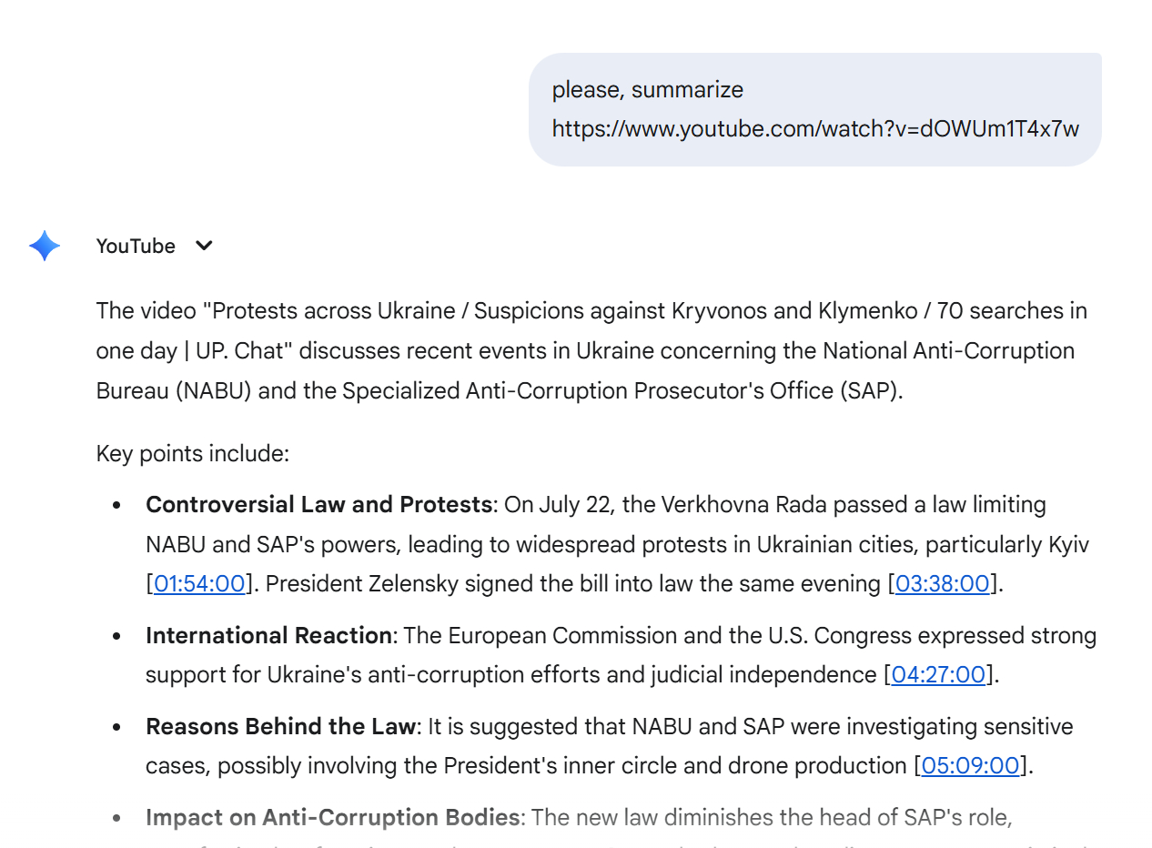 Ще один напрям, де Google тестує можливості Gemini, – це автоматичне підсумовування відео. Усе звучить зручно: замість перегляду годинного лекційного ролика – кілька абзаців зі стислим переказом.