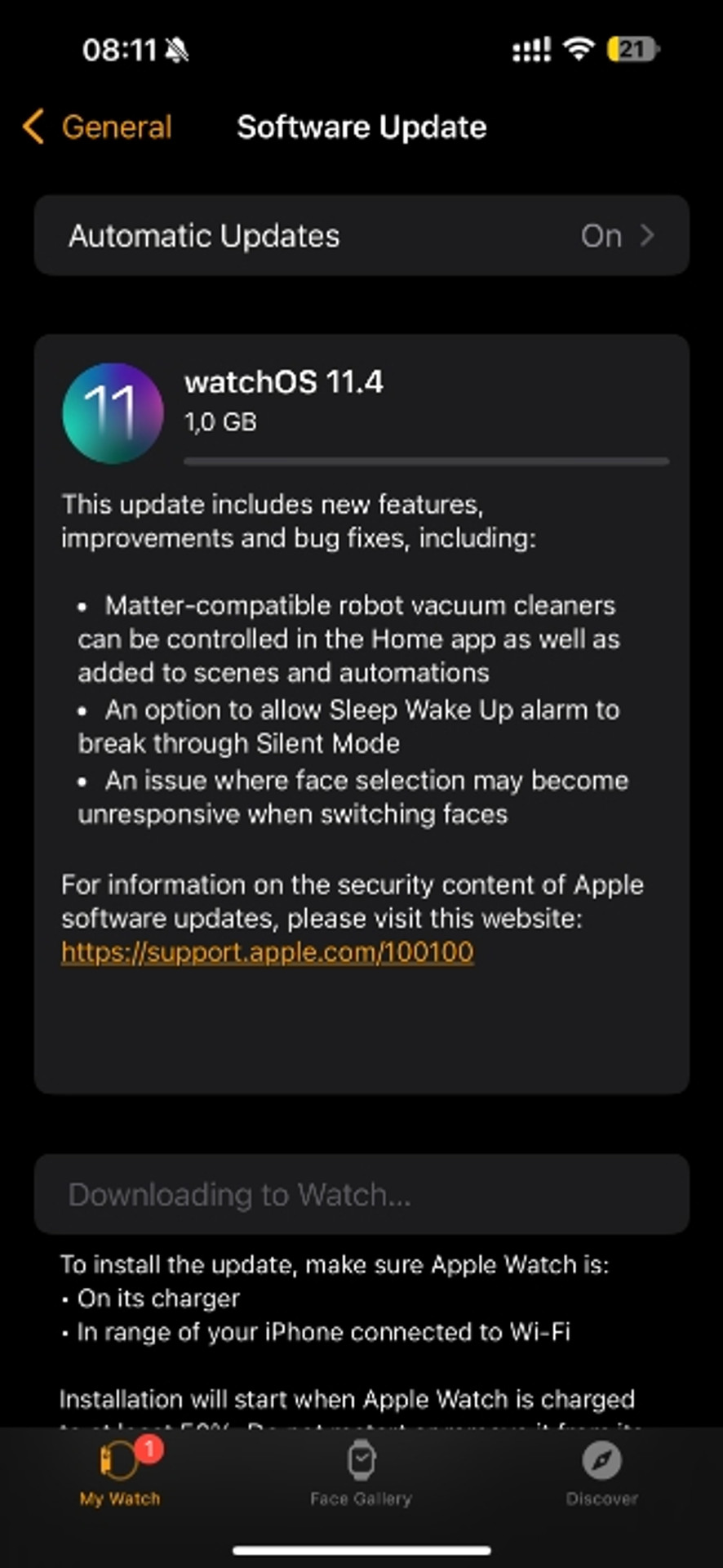 Оновлення watchOS 11.4 можна завантажити через додаток Apple Watch на підключеному iPhone, перейшовши до “Налаштування” > “Загальні” > “Оновлення ПЗ”. Для встановлення системи рівень заряду Apple Watch повинен бути не менше 50%. Годинник має перебувати на зарядці. Розмір прошивки — 1 ГБ.