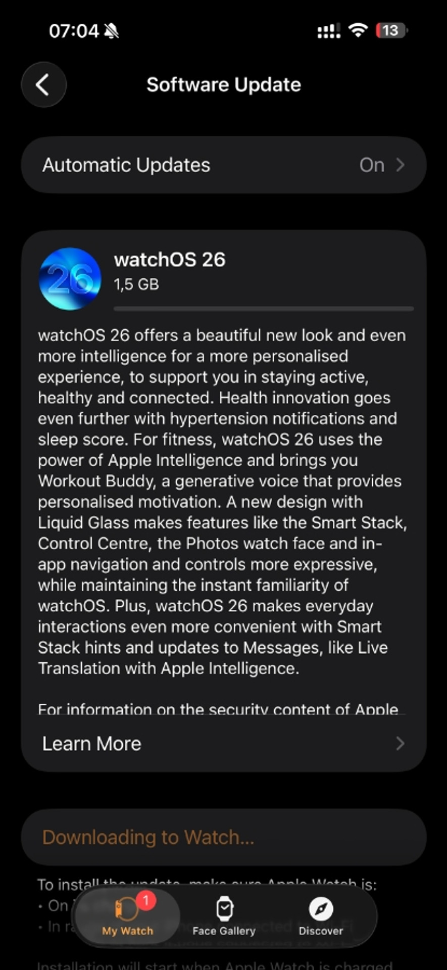 Оновлення можна завантажити через додаток Apple Watch на iPhone або в меню "Налаштування" > "Основні" > "Оновлення ПЗ". Для встановлення годинник має бути заряджений щонайменше на 50% і підключений до зарядки.