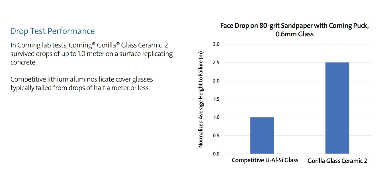 Компанія Corning офіційно анонсувала Gorilla Glass Ceramic 2 – нове покоління загартованого скла для смартфонів, яке забезпечує підвищену міцність та кращий захист від падінь. За даними компанії, це скло здатне витримувати багаторазові падіння з висоти 1 метра на бетон, що робить його одним із найміцніших рішень на ринку.