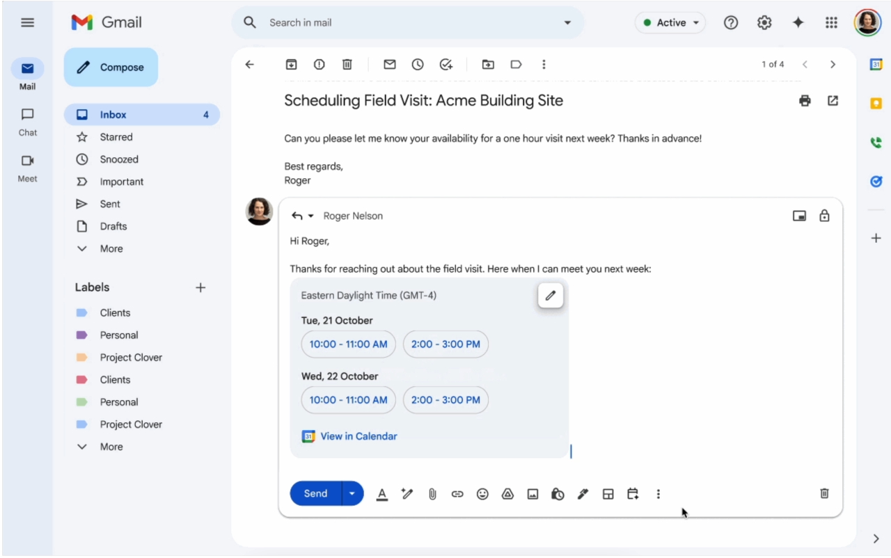 Наприклад, якщо хтось попросить про 30-хвилинну зустріч наступного тижня, Gemini запропонує часові проміжки, які відповідають вашій доступності.