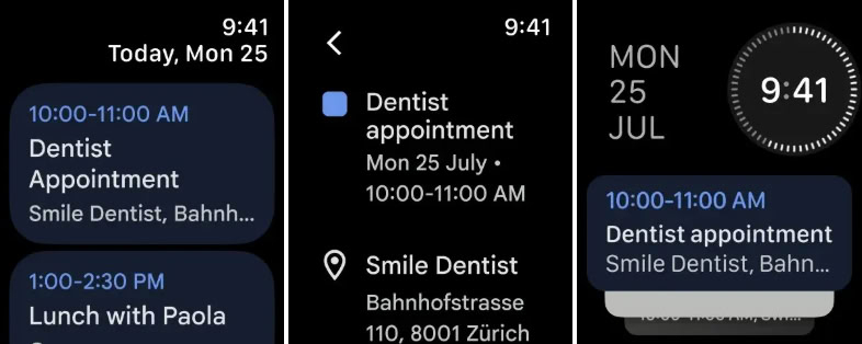 Google Calendar для Apple Watch також пропонує два віджети (complications): перший показує найближчу заплановану подію, другий — поточну дату. Обидва відкривають застосунок при натисканні. Також доступний віджет у Smart Stack.