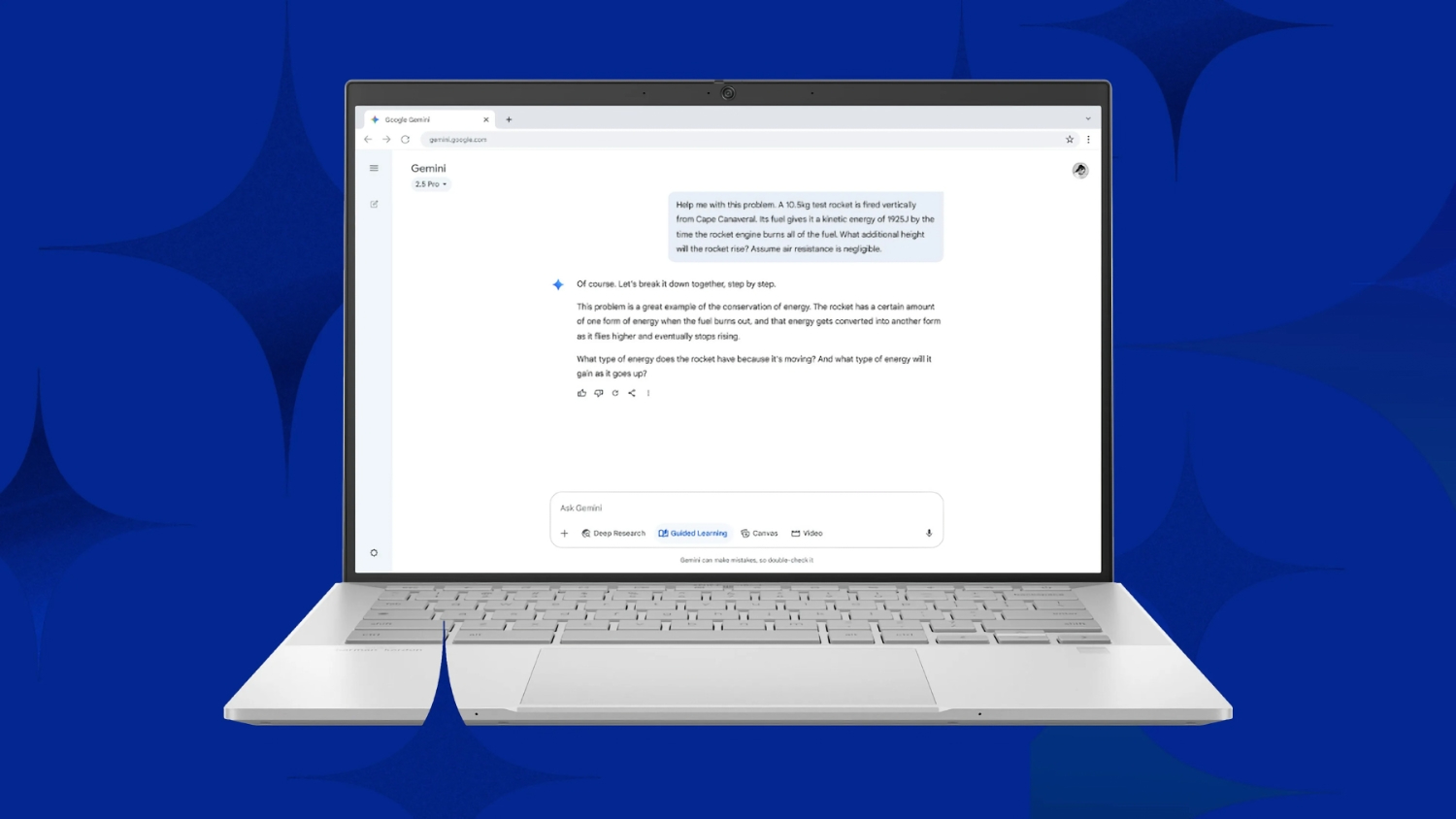 Учні можуть звертатися до ШІ з запитаннями будь-коли. У відповідь Guided Learning зазвичай надає контекстні підказки, що спонукають до самостійного пошуку відповіді, часто переформульовуючи запит замість того, щоб одразу розв’язати його. Якщо студент відволікається від теми, ШІ визнає його зацікавлення, але делікатно повертає до основного матеріалу.
