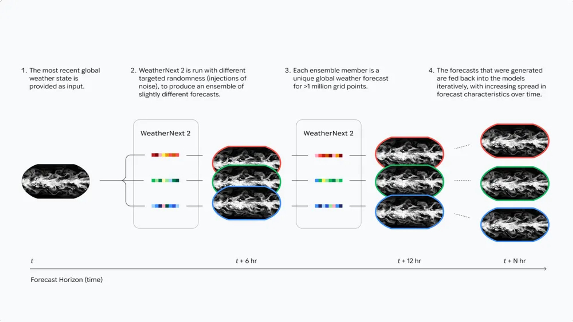 WeatherNext 2 використовує нову архітектуру Functional Generative Network (FGN), яка дозволяє створювати прогнози одним проходом – замість багатьох повторних ітерацій, необхідних у попередніх ШІ-моделях. Модель прогнозує погоду до 15 днів наперед і формує погодинні дані.