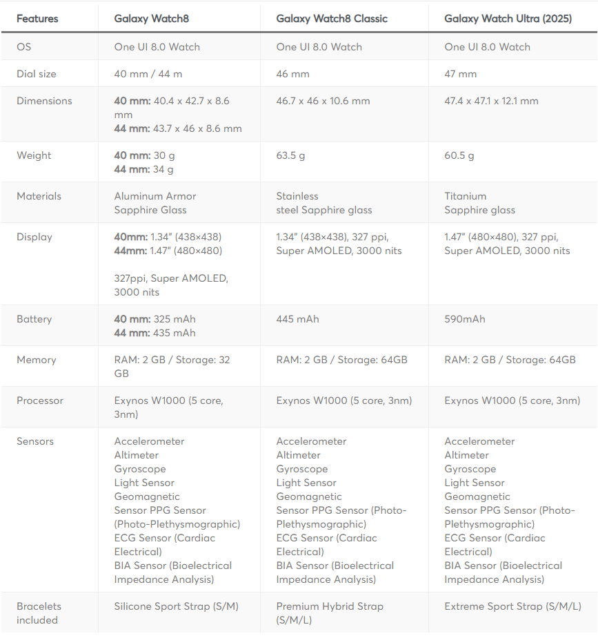 Усі пристрої працюватимуть на системі One UI 8.0 Watch, отримають новий процесор Exynos W1000 (3 нм, 5 ядер), Super AMOLED-екран яскравістю до 3000 ніт, підтримку численних сенсорів і 2 ГБ оперативної пам’яті. Обсяг сховища — 32 ГБ для Galaxy Watch 8 та 64 ГБ для моделей Classic та Ultra. Повні технічні характеристики нових смартгодинників від Samsung можна побачити нижче.