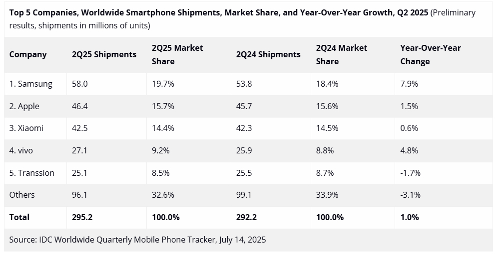 У другому кварталі 2025 року світове постачання смартфонів зросло на 1%, до 295,2 мільйона одиниць. Хоч ситуація загалом позитивна, попит падає через мита та економічну нестабільність, особливо на недорогі моделі. Попри це, Samsung змогла ще більше зміцнити своє лідерство, повідомляє International Data Corporation (IDC).