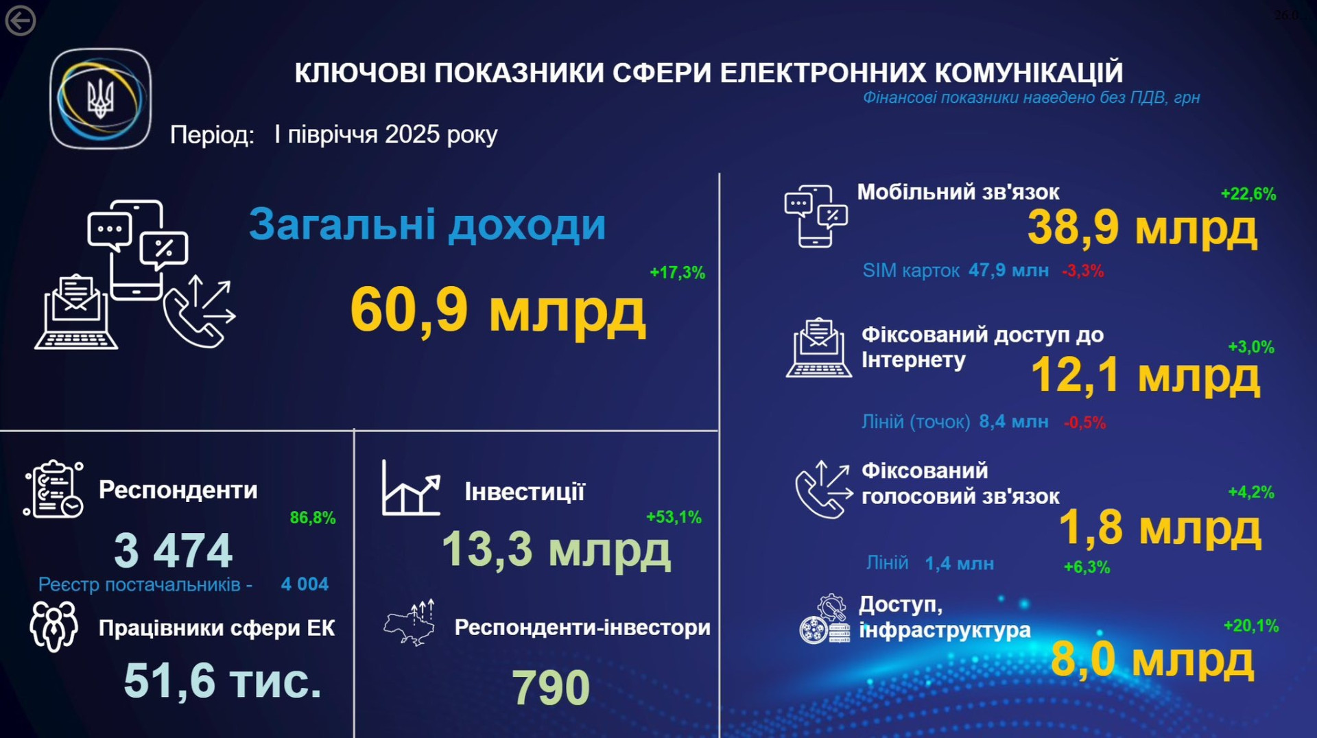 За перше півріччя 2025 року доходи сектору електронних комунікацій склали 60,9 мільярда гривень, на 17,3% у порівнянні з тим самим періодом минулого року. Про це йдеться у звіті Національної комісії, що здійснює державне регулювання у сферах електронних комунікацій, радіочастотного спектра та надання послуг поштового зв'язку (НКЕК).