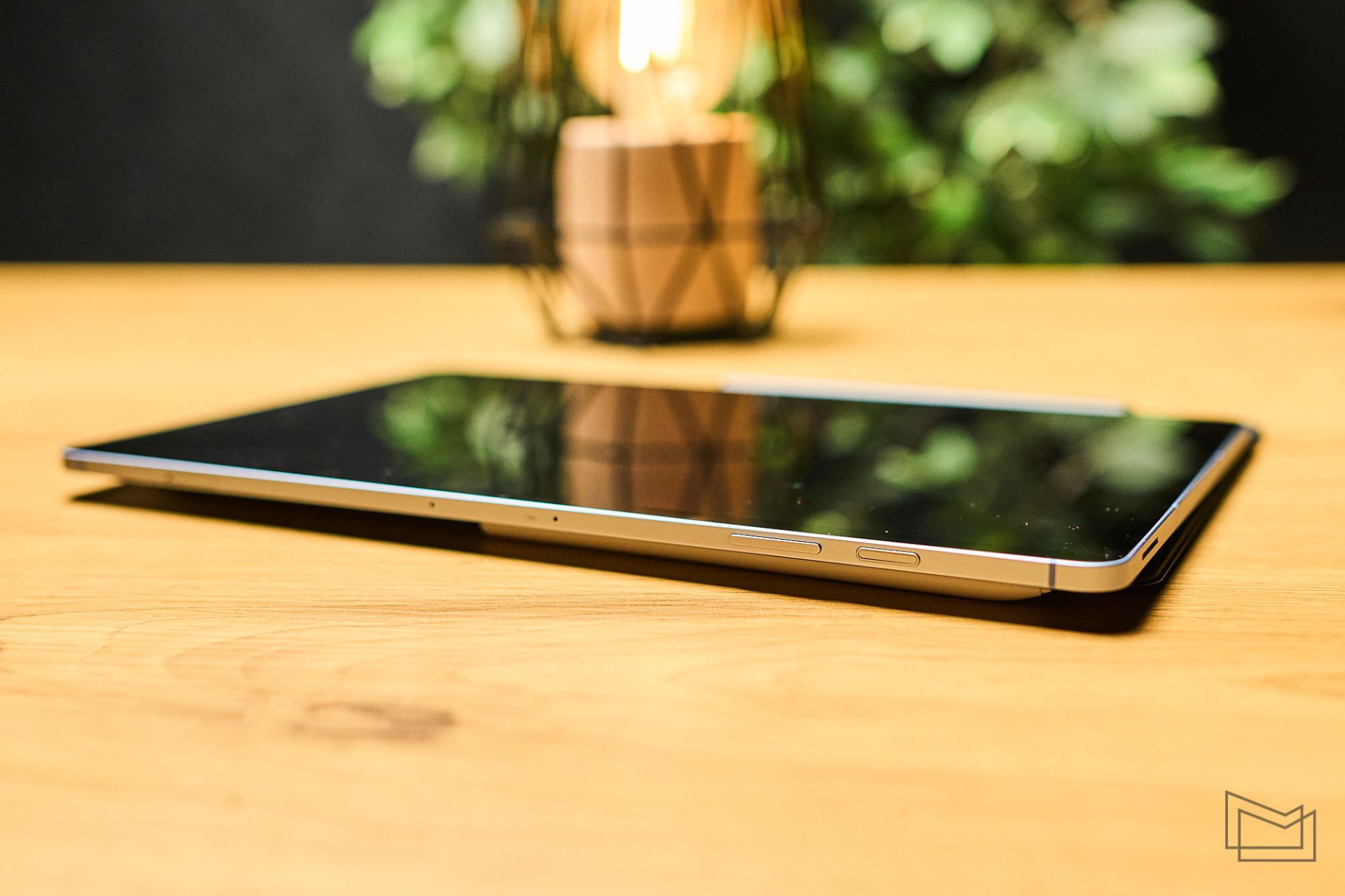 Якщо тримати планшет в ландшафтній орієнтації, то на його бокових гранях можна знайти стереодинаміки та порт USB-C. На верхньому торці знаходяться кнопки регулювання гучності та живлення, в яку вбудовано сканер відбитків пальців. На нижньому торці – магнітний Pogo-конектор для підключення фірмової клавіатури-обкладинки.