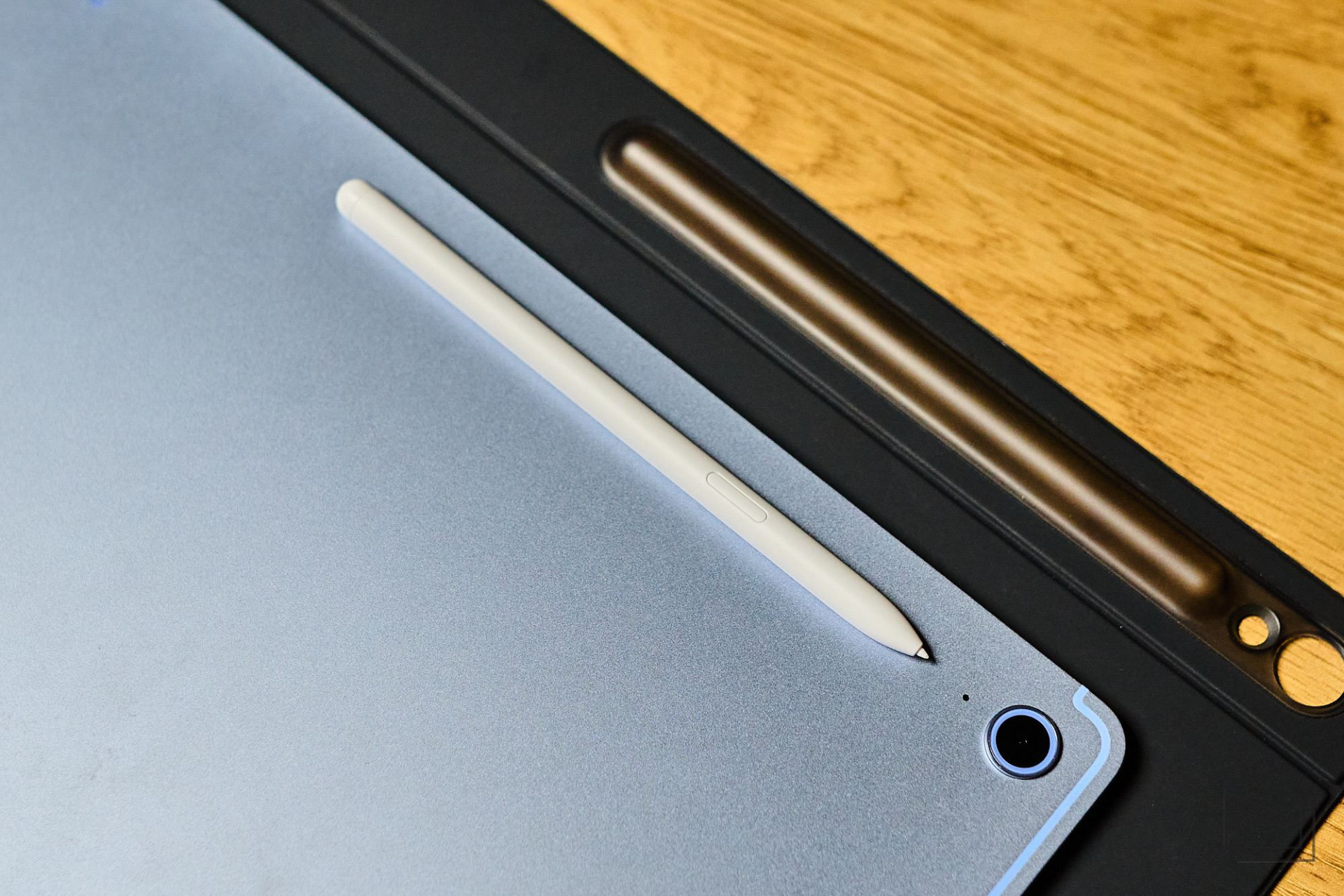Також варто зауважити, що перо S Pen одразу йде в комплекті з планшетом і кріпиться ззаду корпусу поруч з камерою в спеціальному намагніченому місці. Вбудованого відсіку немає, але магніти достатньо міцні, щоб перо не губилося в сумці. Як і сам планшет, S Pen захищений від води за стандартом IP68, тому ним можна писати під дощем або на виробництві у пильному приміщенні.