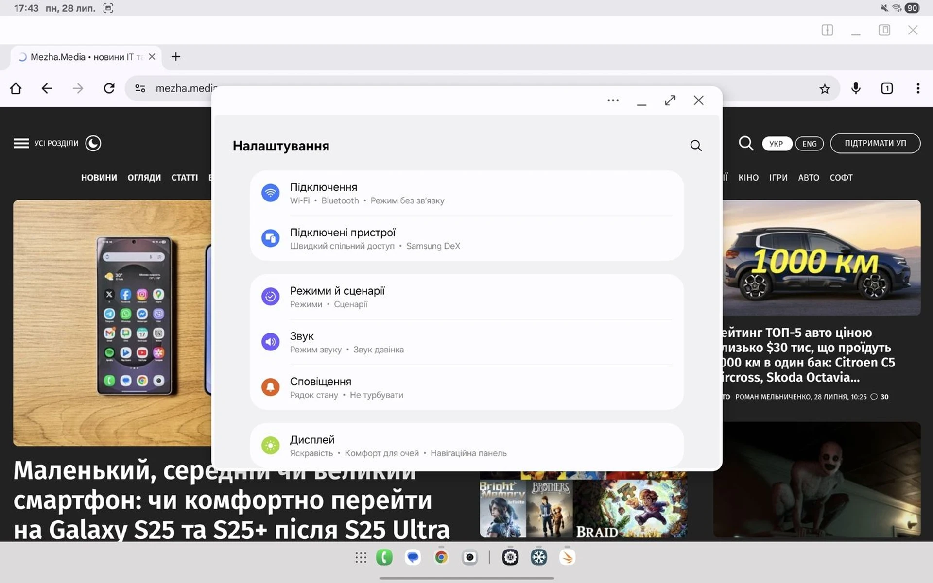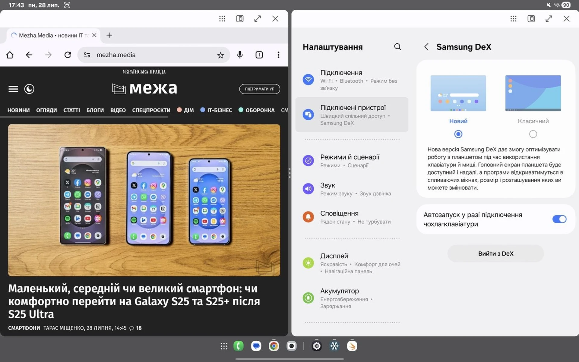 В цій моделі також є підтримка Samsung DeX, яка дозволяє отримати щось схоже на інтерфейс Windows з окремими вікнами, розмір яких можна міняти та розташовувати поруч. Попри побоювання, що DeX може бути "важкуватим" для цієї моделі, планшет доволі непогано з ним справляється. Є невеликі паузи, наприклад, при відкритті меню з програмами, але самі застосунки працюють коректно, й це дозволяє покращити продуктивність у деяких випадках. На жаль, через обмеження порту USB-C (стандарт 2.0) Tab S10 FE не вміє передавати зображення на зовнішній екран через кабель, відеовихід просто не підтримується апаратно. Це прикро, адже старші моделі Tab S дозволяють під'єднати монітор і працювати на більшому екрані.