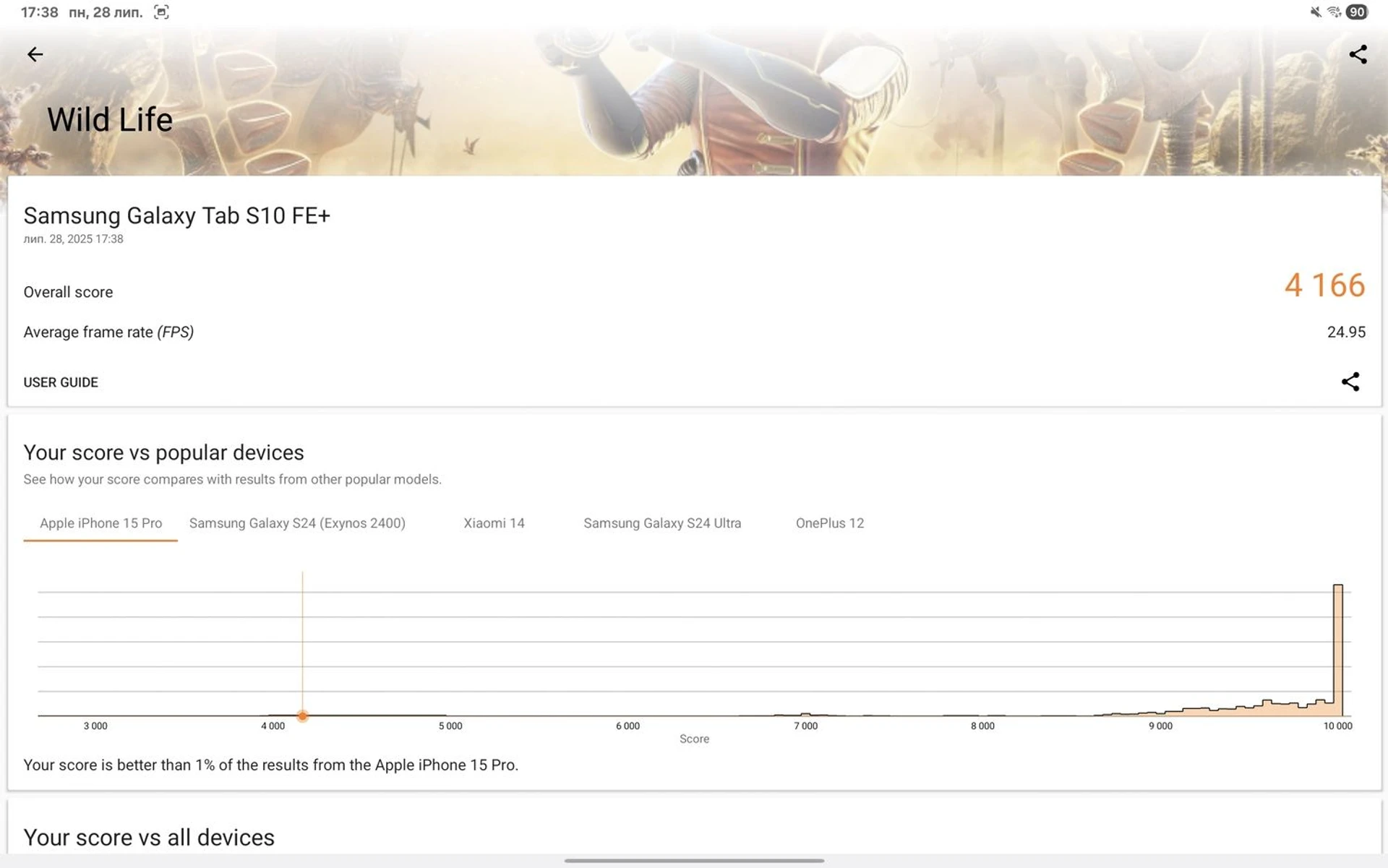 Щодо ігор, ситуація прогнозована: важкі ігри планшета даються важкувато. Ігри на кшталт Fortnite або Genshin Impact можна запустити, але або з низькими налаштуваннями графіки, або змирившись з просіданнями FPS. Проте для казуальних ігор продуктивності більш ніж достатньо. І якщо планшет планується для роботи та навчання, Tab S10 FE пропонує достатню швидкодію й навряд розчарує.