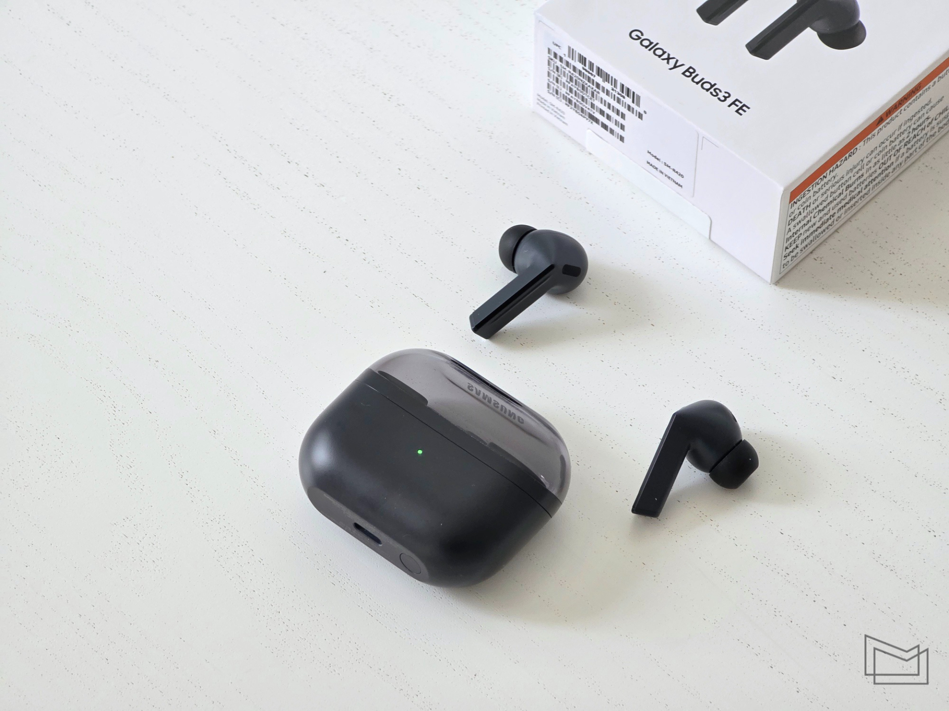 Заряджається кейс через роз’єм USB-C (кабель йде у комплекті). Безпровідної зарядки в цій моделі нема, ще одне спрощення, яке відрізняє Fan Edition від дорожчих Galaxy Buds3 Pro. На щастя, підтримується функція швидкої зарядки. Аби повністю зарядити самі навушники в кейсі, достатньо приблизно 40–60 хвилин, а 5-хвилинної підзарядки вистачить на приблизно годину прослуховування. Повний цикл зарядки кейса через кабель займає близько 1,5 год. В цілому, підсумовуючи, автономність Buds3 FE навряд чи стане проблемою у повсякденному користуванні, якщо регулярно класти навушники в кейс у паузах між прослуховуванням.