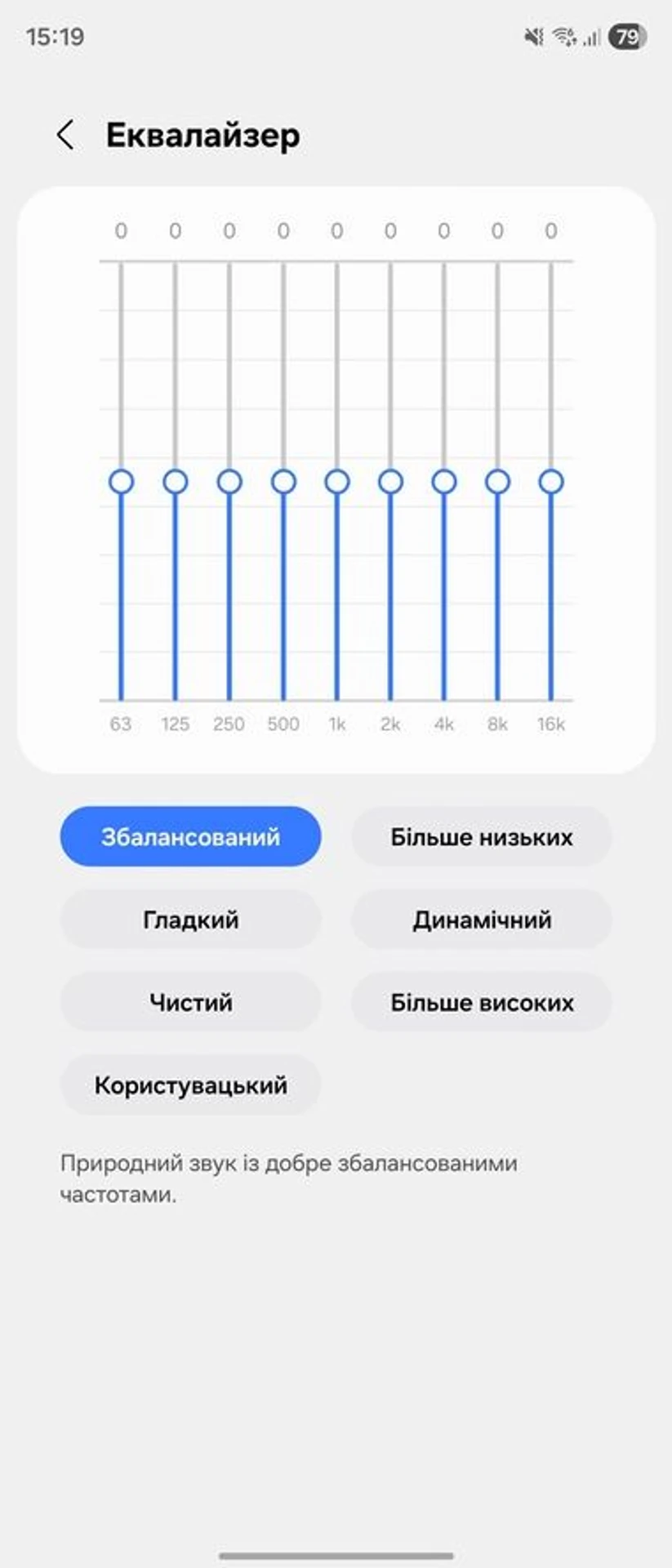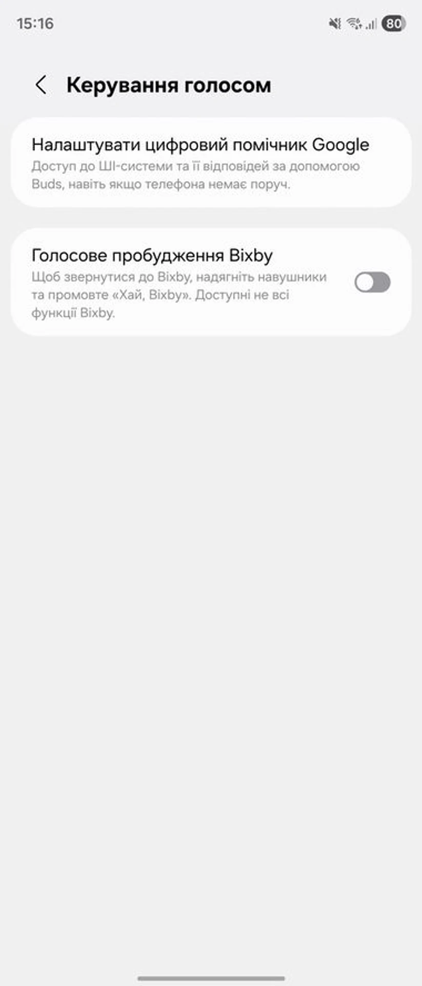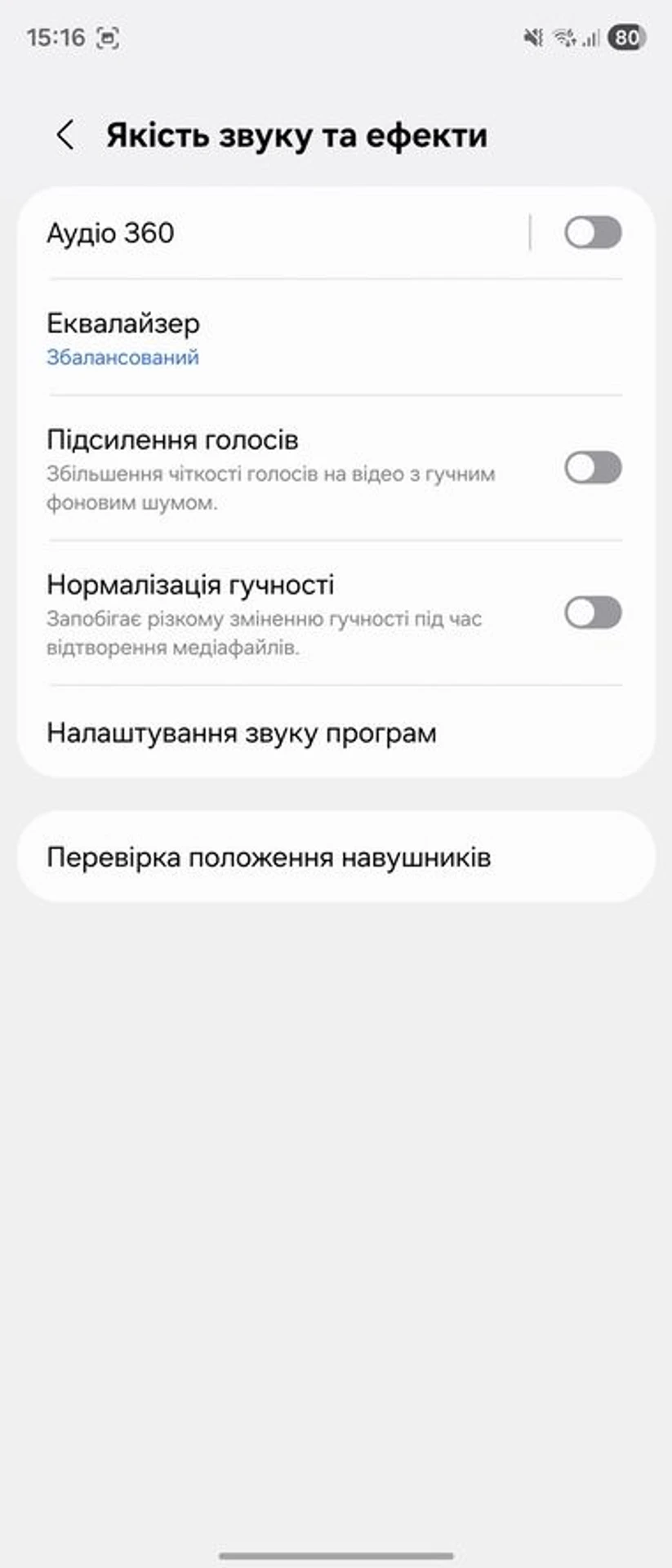 Для всіх інших налаштувань використовується застосунок Galaxy Wearable (на смартфонах Samsung з One UI 8.0+ ключові опції Buds3 FE тепер інтегровані прямо в системні налаштування). Через додаток можна перемикати режими шумозаглушення та прозорості, переглядати рівень заряду кожного навушника і кейса, оновлювати прошивку, а також налаштовувати еквалайзер та функції на кшталт 360 Audio та голосового помічника.
