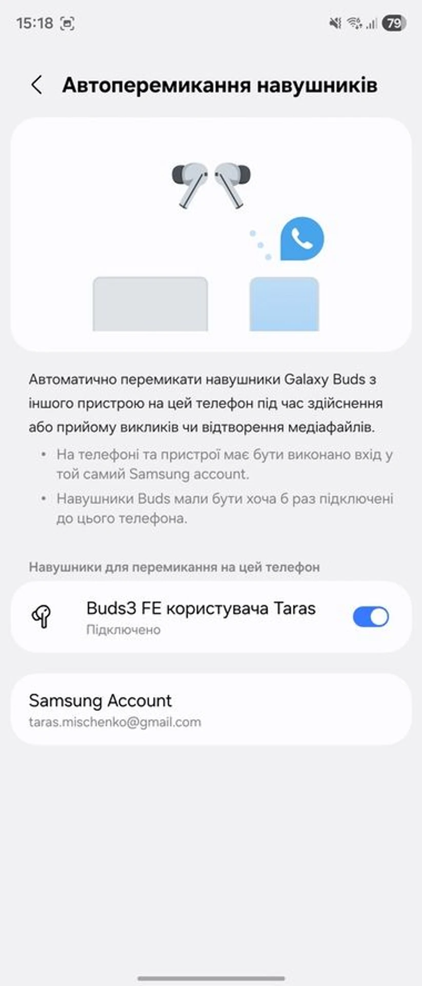 На зарядному кейсі є окрема кнопка для спрощення сполучення, вона дозволяє швидко перевести навушники в режим підключення і перемикатися між пристроями Samsung. Також функція Auto Switch автоматично визначає, на якому пристрої Galaxy відтворюється звук, і миттєво перемикає підключення навушників на нього. Це зручно, наприклад, коли ви дивилися відео на планшеті, а потім берете телефон для дзвінка, Buds3 FE самі перемкнуться на смартфон.