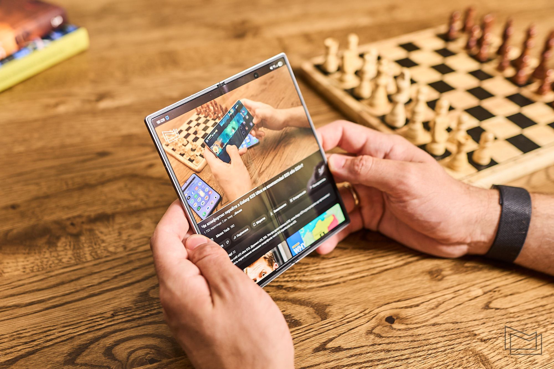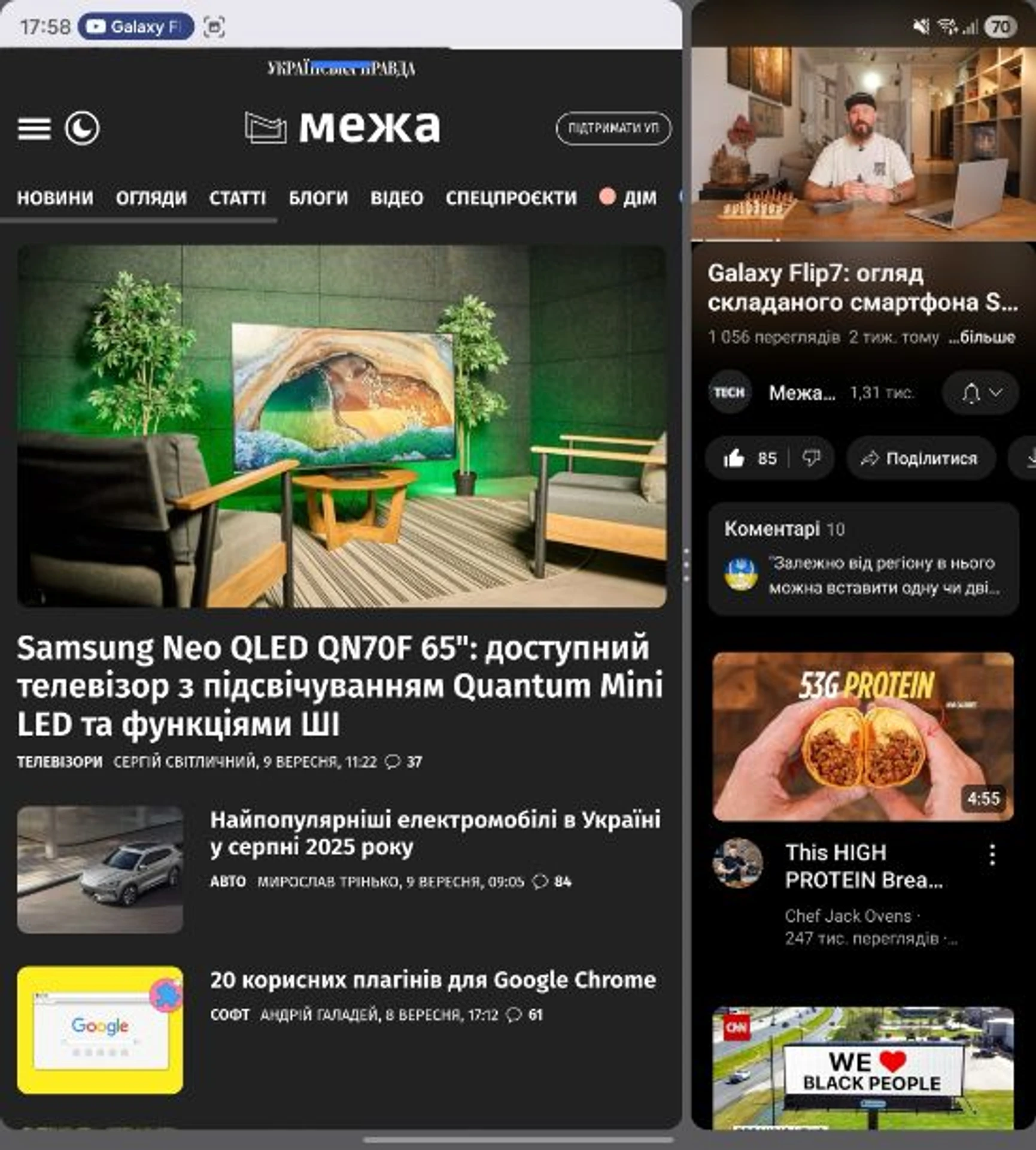 Ще трохи зупинюся на режимі Flex – це коли смартфон зігнутий під кутом 90° (половина екрана стоїть, половина лежить). У цьому режимі багато програм адаптуються: YouTube показує відео на верхній половині, а управління відтворенням – знизу. Камера взагалі отримує режим мініштатива – можна поставити Fold як "ноутбук" і робити групові фото або таймлапси, не тримаючи його.