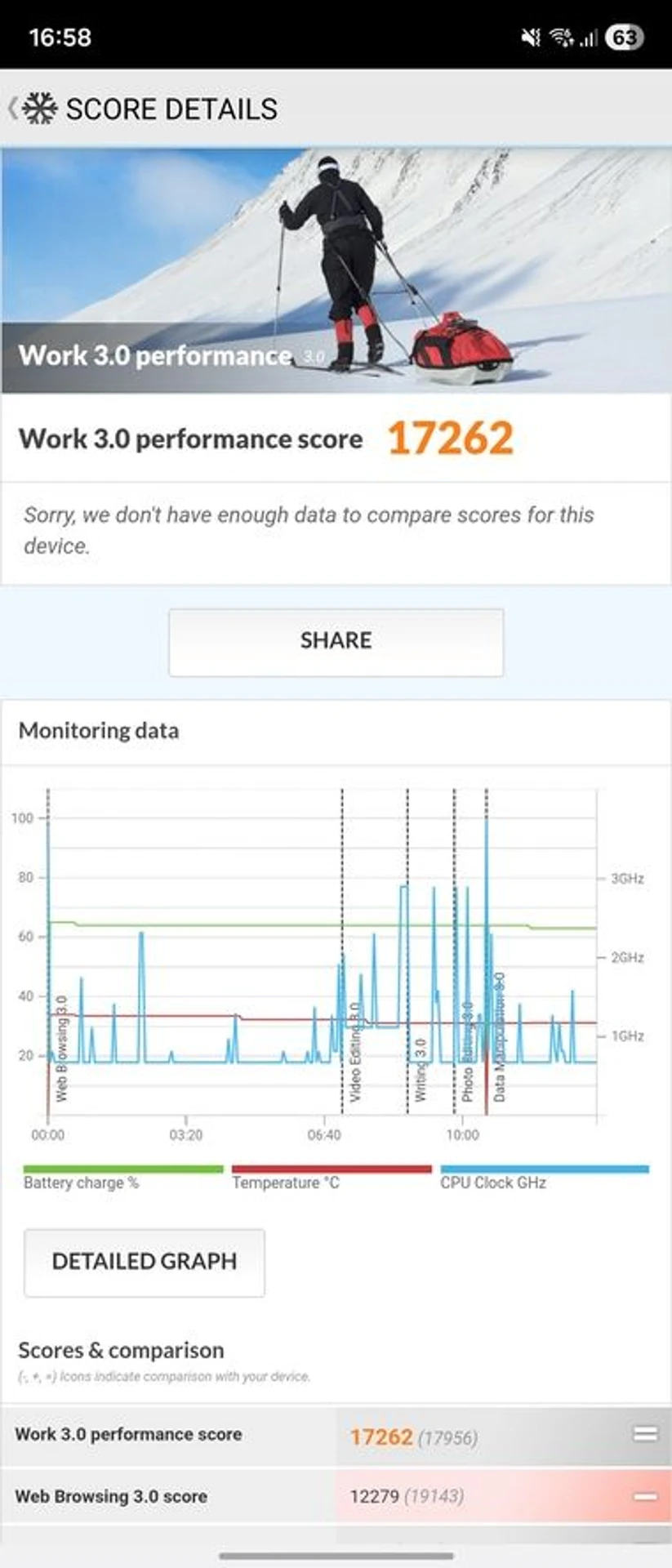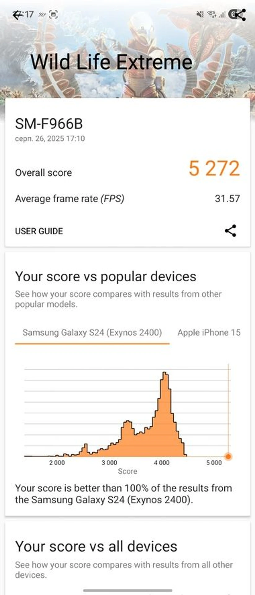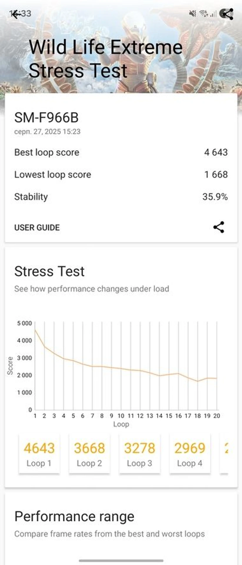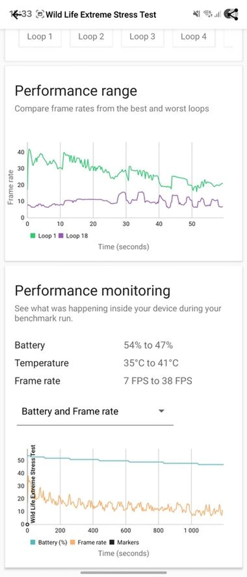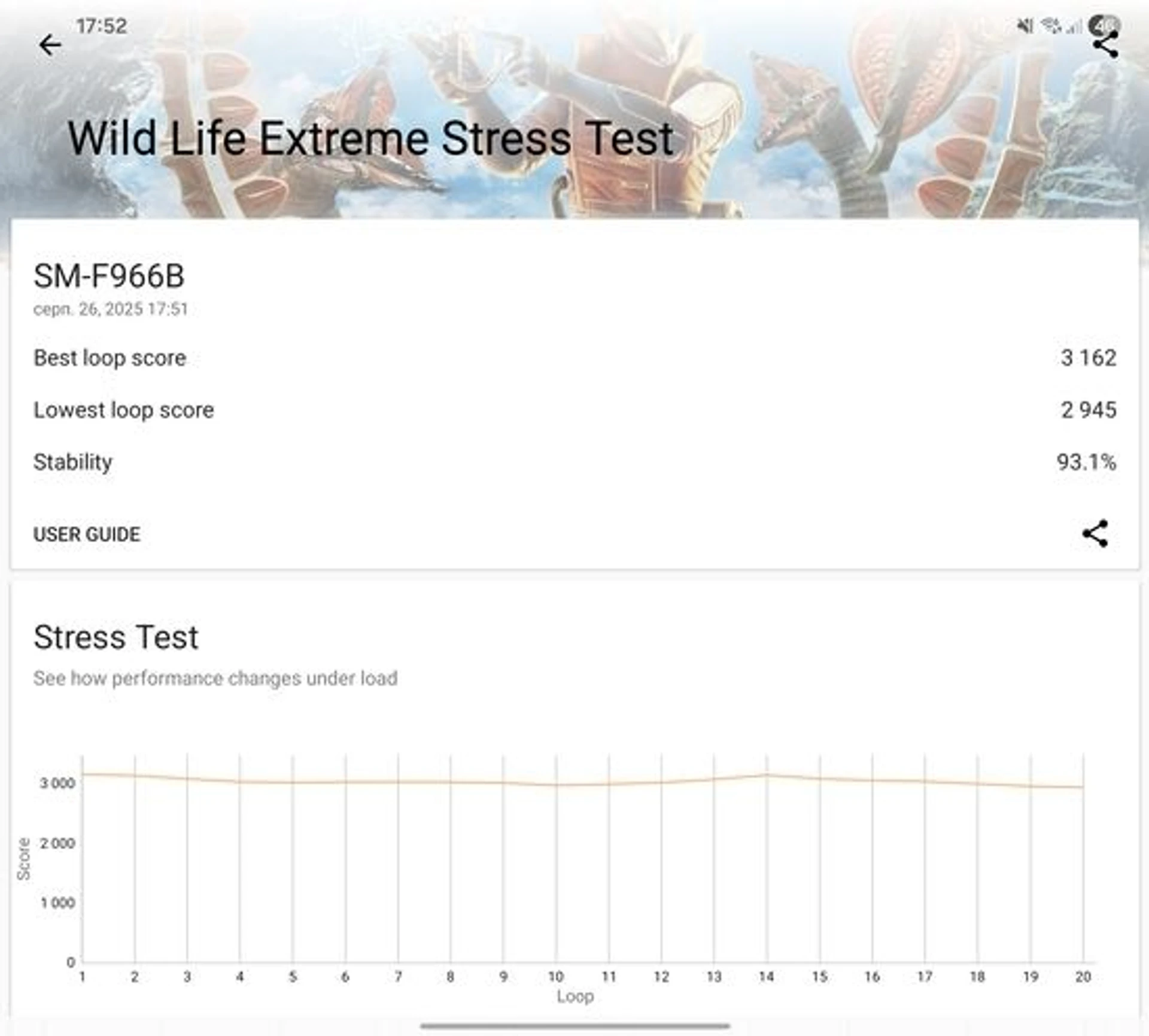 Під навантаженням корпус Galaxy Fold7 може нагріватися, особливо половина з блоком камер, в яку й встановлено процесор. Проте апарат дещо по різному поводить себе залежно від того, знаходиться він у відкритому чи закритому положенні. В останньому випадку нагрів корпусу трохи вищий, але в межах комфортного використання, а от в розкритому положенні здається, що смартфон взагалі не гріється, містика? Насправді все доволі просто і щоб показати, що саме відбувається з процесором, візьмемо стрес-тест 3Dmark Wild Life Extreme.