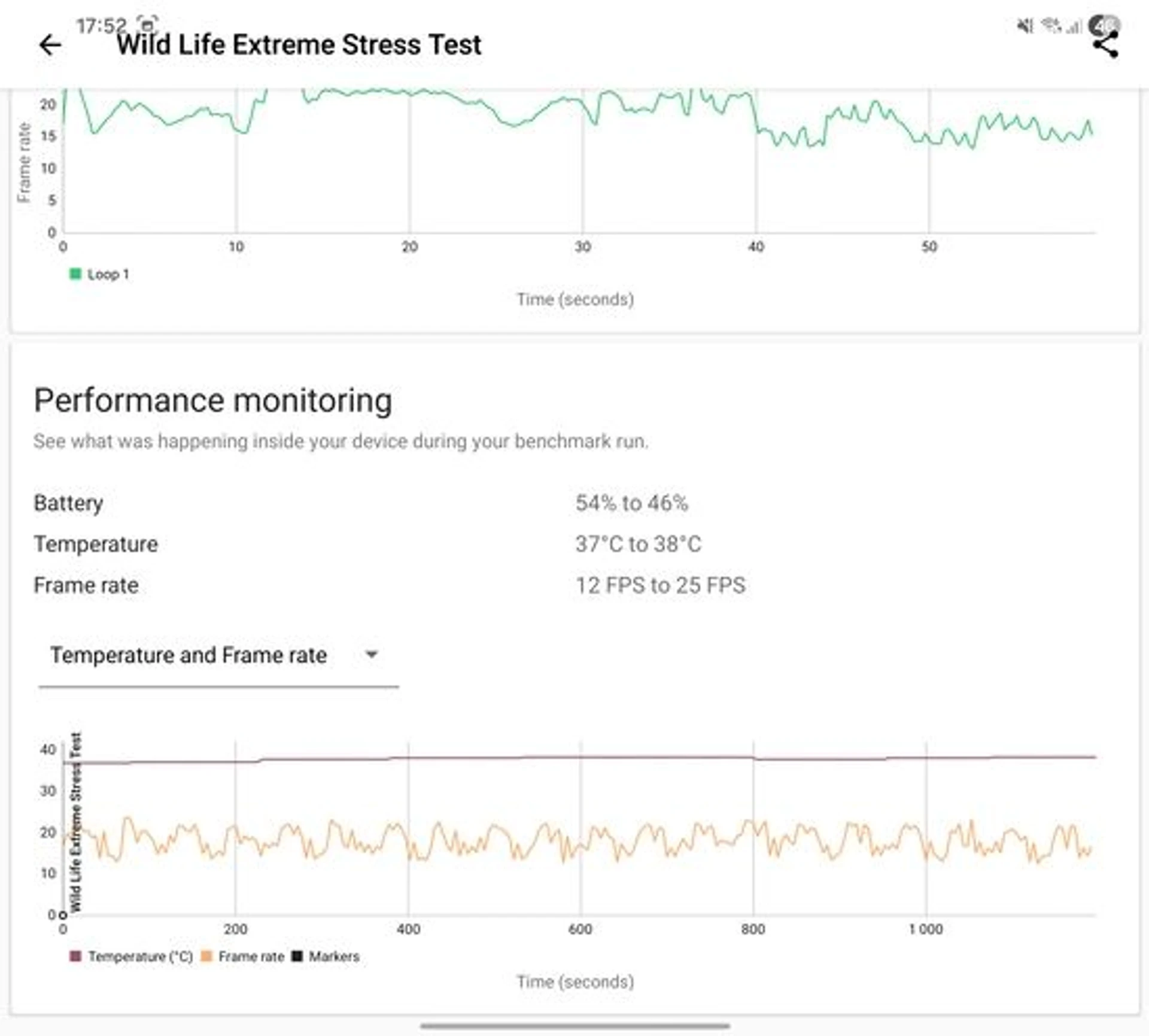 Якщо ж розкрити смартфон та запустити той самий тест, то він починає балансувати швидкість роботи та нагрів, з самого початку не надаючи максимум, але при цьому й сильно не скидаючи частоти на всіх колах тесту. Виходить найкраща стабільність, яку я останнім часом бачив на флагманах, і навіть кількість набраних балів в найгіршому колі тесту виявляється вищою, ніж у Galaxy S25 Ultra. Температура процесора при цьому не перевищує 35 градусів Цельсія, що робить корпус взагалі злегка теплим.