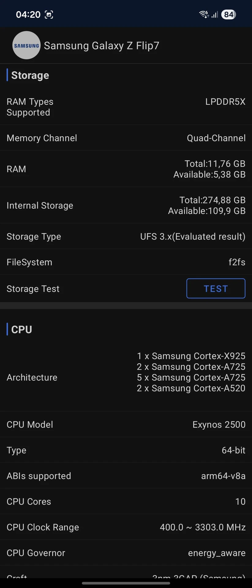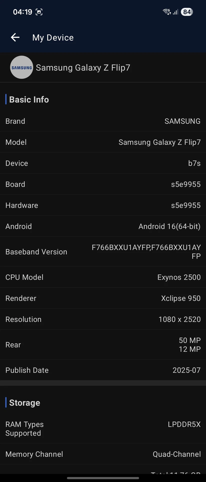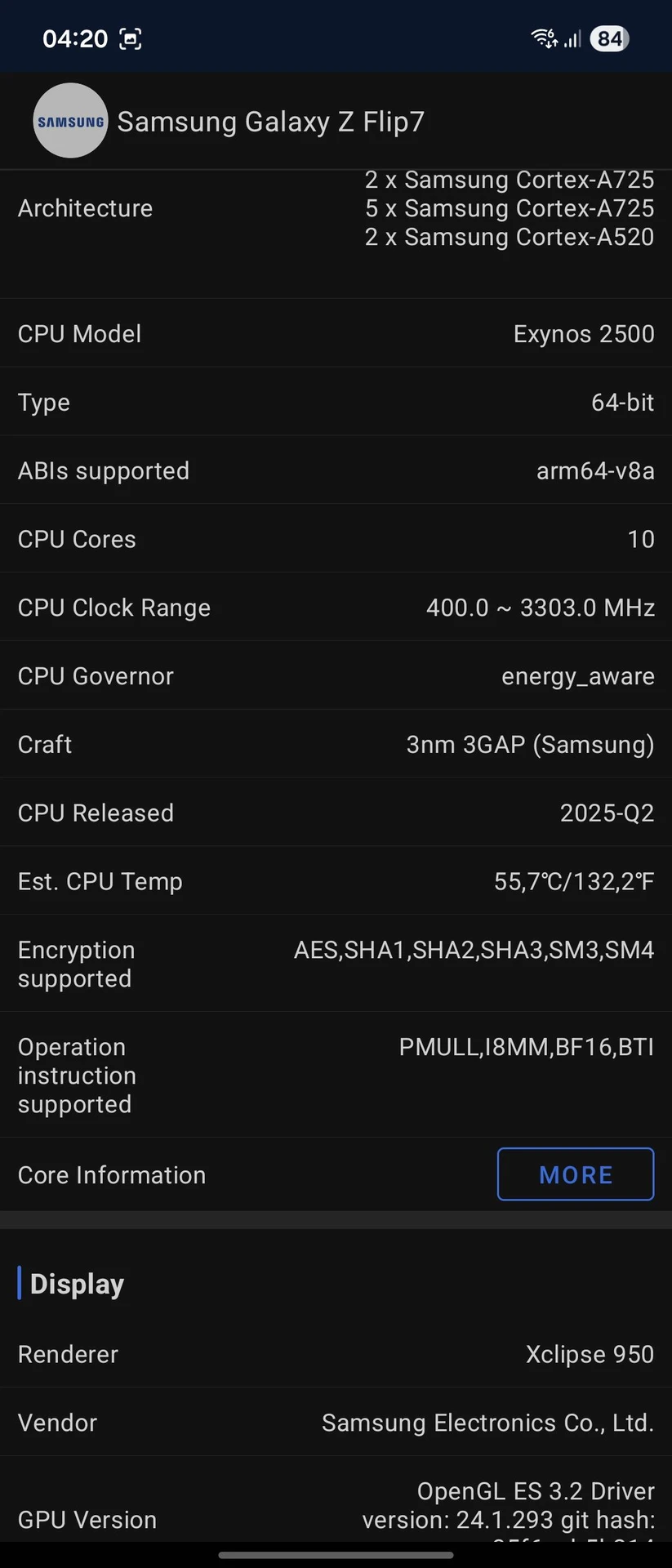 Раніше усі складані смартфони Samsung постачались виключно з флагманськими процесорами Qualcomm Snapdragon. Цього року компанія вирішила випустити Fold7 з топовим Snapdragon, а Samsung Galaxy Flip7 отримав новий процесор власного виробництва Exynos 2500. Як і минулий Exynos 2400, це — 10-ядерний процесор, але конфігурація і техпроцес інші. Exynos 2500 виробляється за 3-нм технологічним процесом і містить 1 ядро ARM Cortex-X5 з частотою 3,3 ГГц, 2 ядра Cortex-A725 по 2,75 ГГц, 5 ядер Cortex-A725 по 2,36 ГГц та 2 Cortex-A520 по 1,8 ГГц. Графічний прискорювач Xclipse 950.