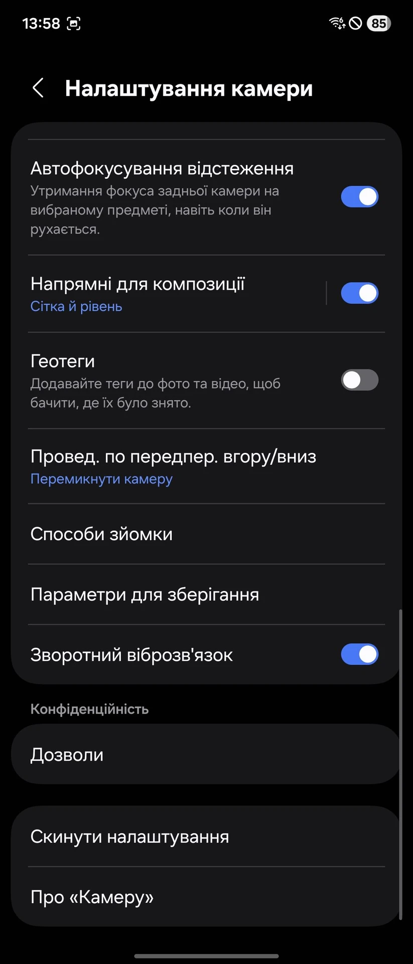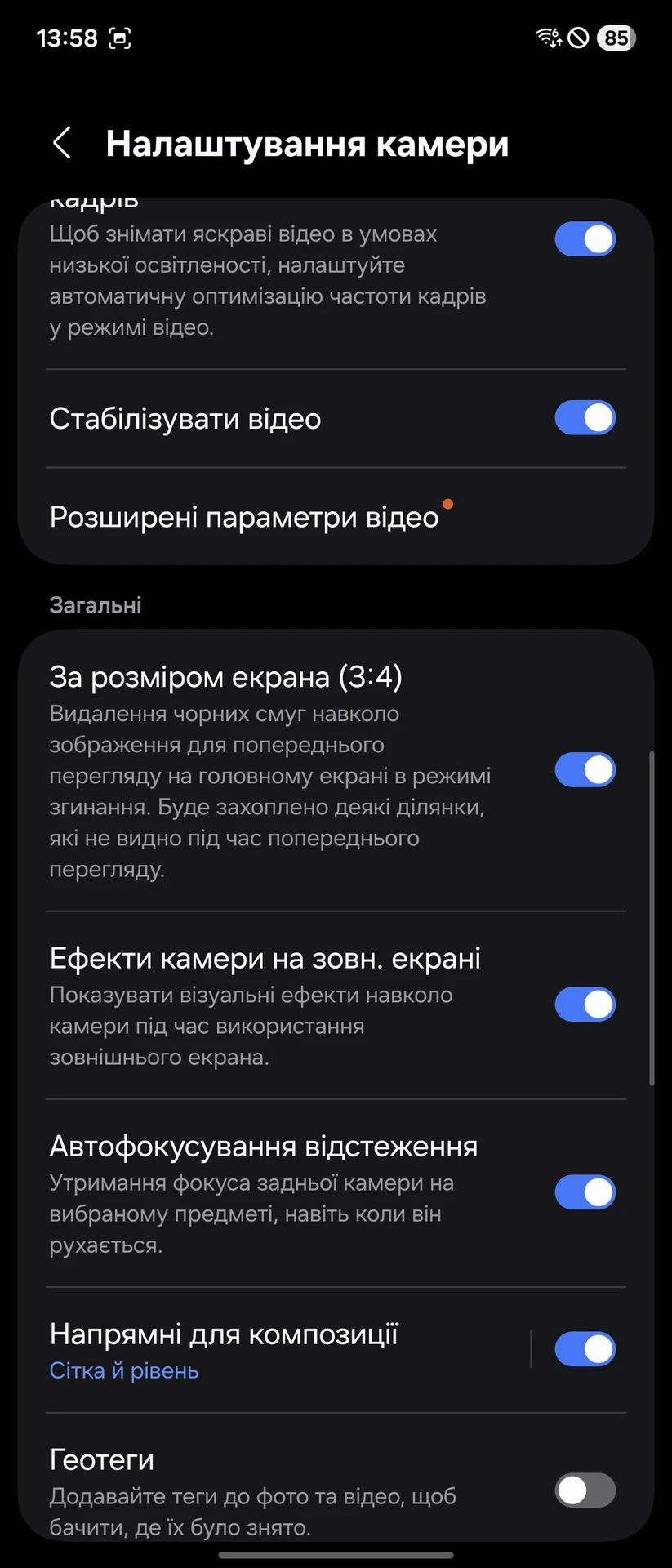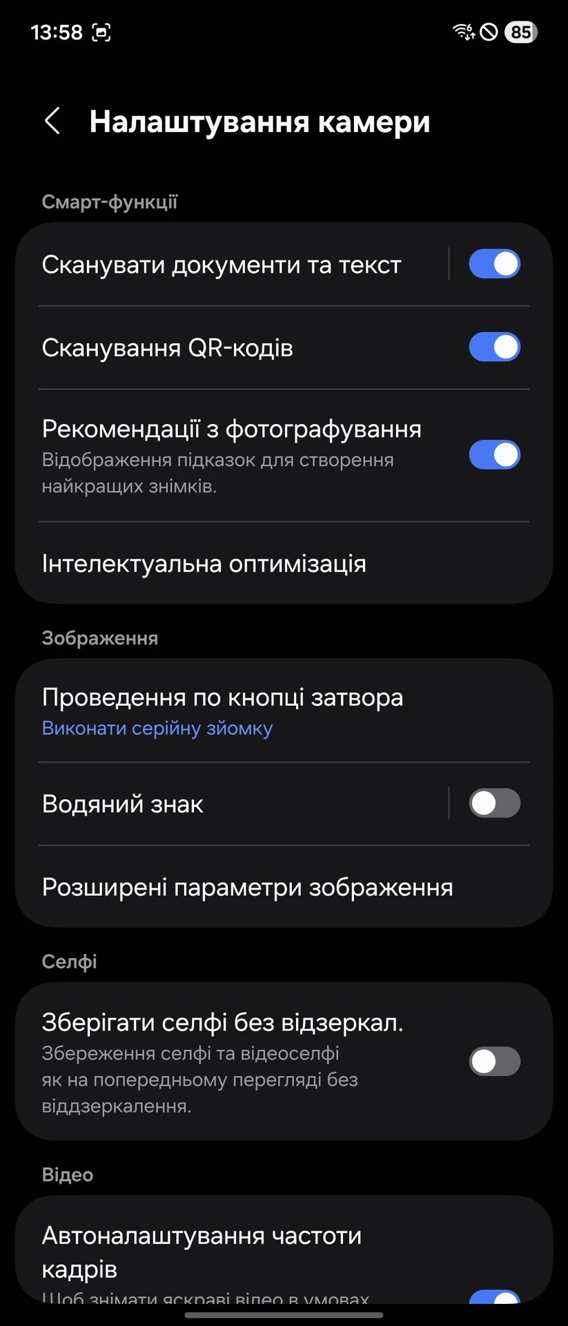 Застосунок камери має цілком звичний інтерфейс. На екрані видошукача є усі базові налаштування, включно зі спалахом, співвідношенням сторін кадру, таймером, роздільною здатністю, кадровою частотою тощо. Додаткові налаштування є у випадаючому меню. Режими знімання перемикаються горизонтальними свайпами. З додаткових елементів керування є кнопка для активації прев’ю на зовнішньому екрані.
