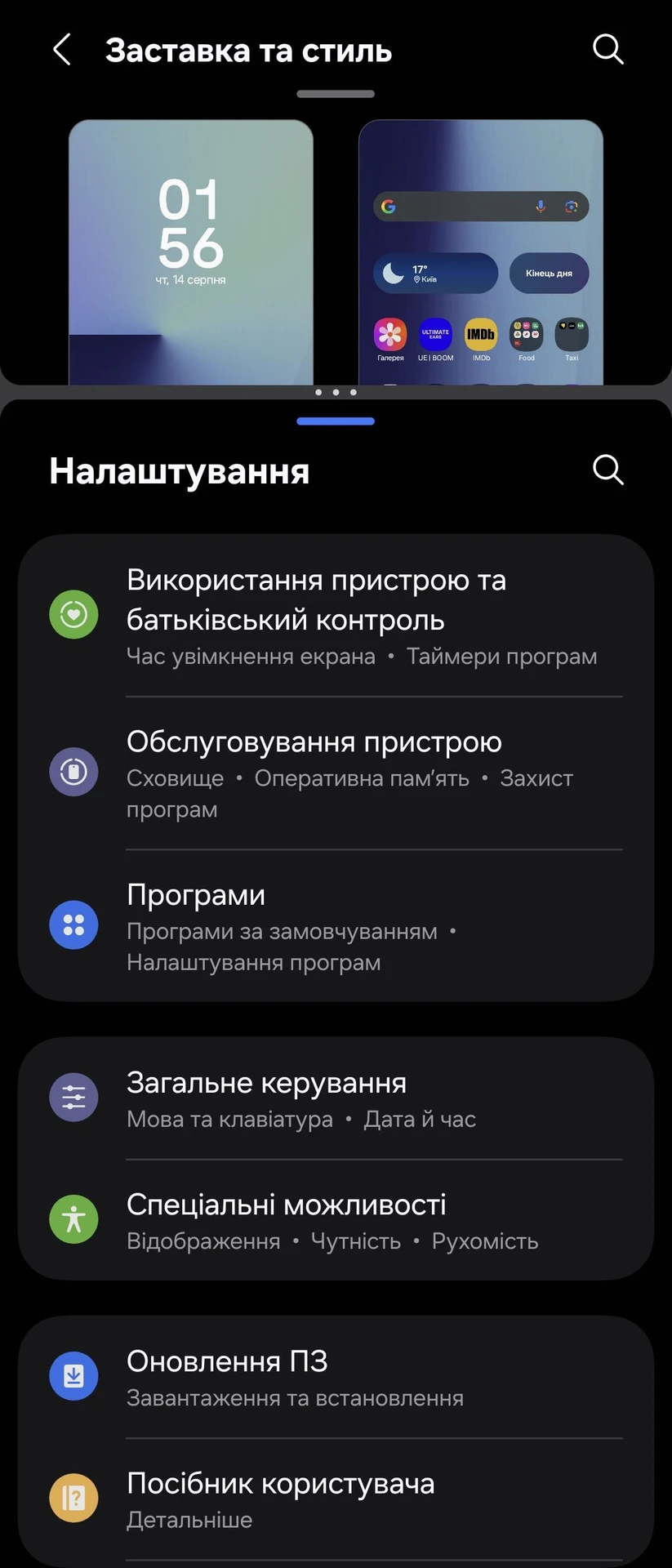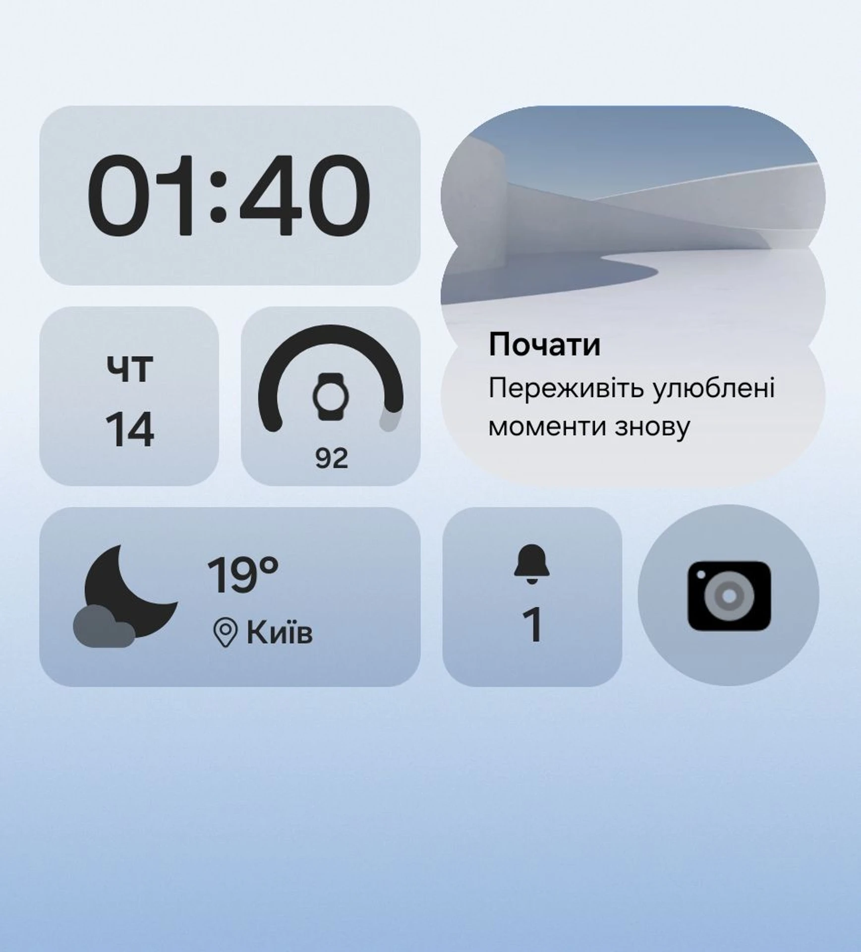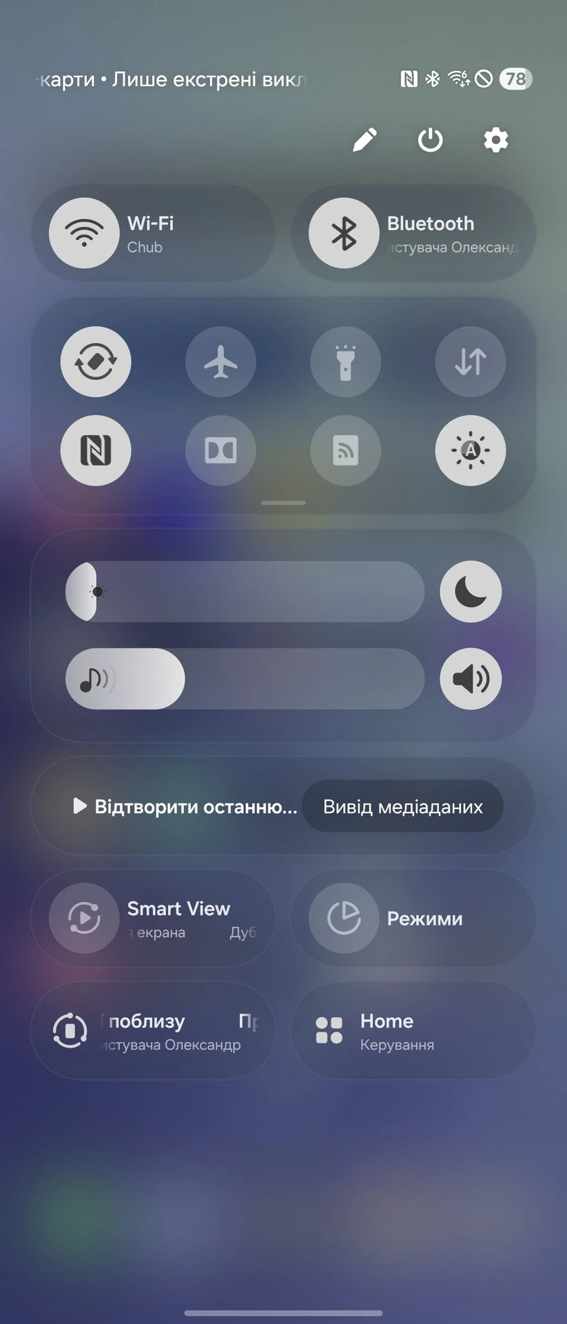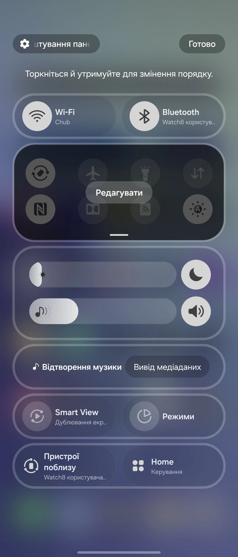 Є готові віджети погоди, календаря, Samsung Health тощо. Також є підримка карт, YouTube, застосунків для повідомлень та дзвінків. Верхня шторка має усі базові перемикачі, але налаштувати її не можна.