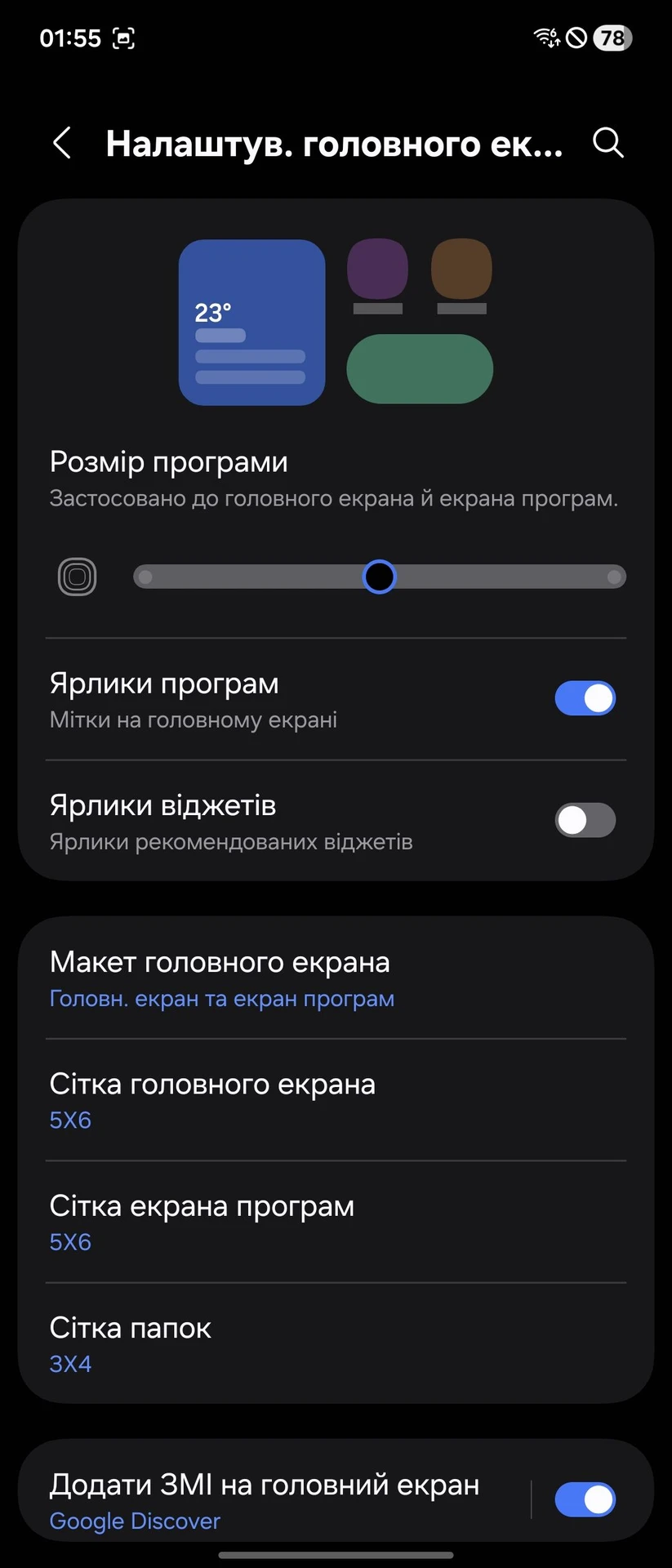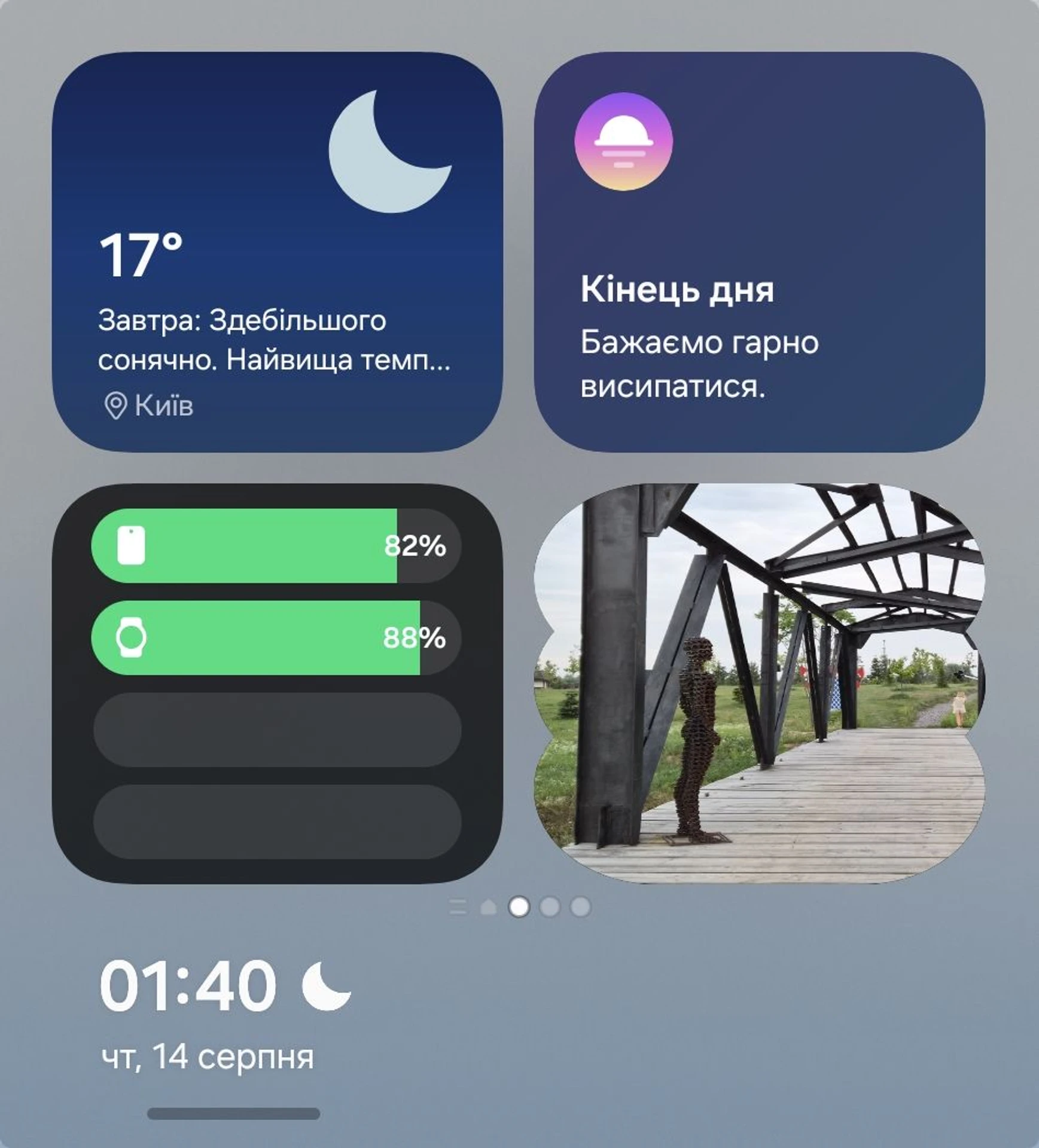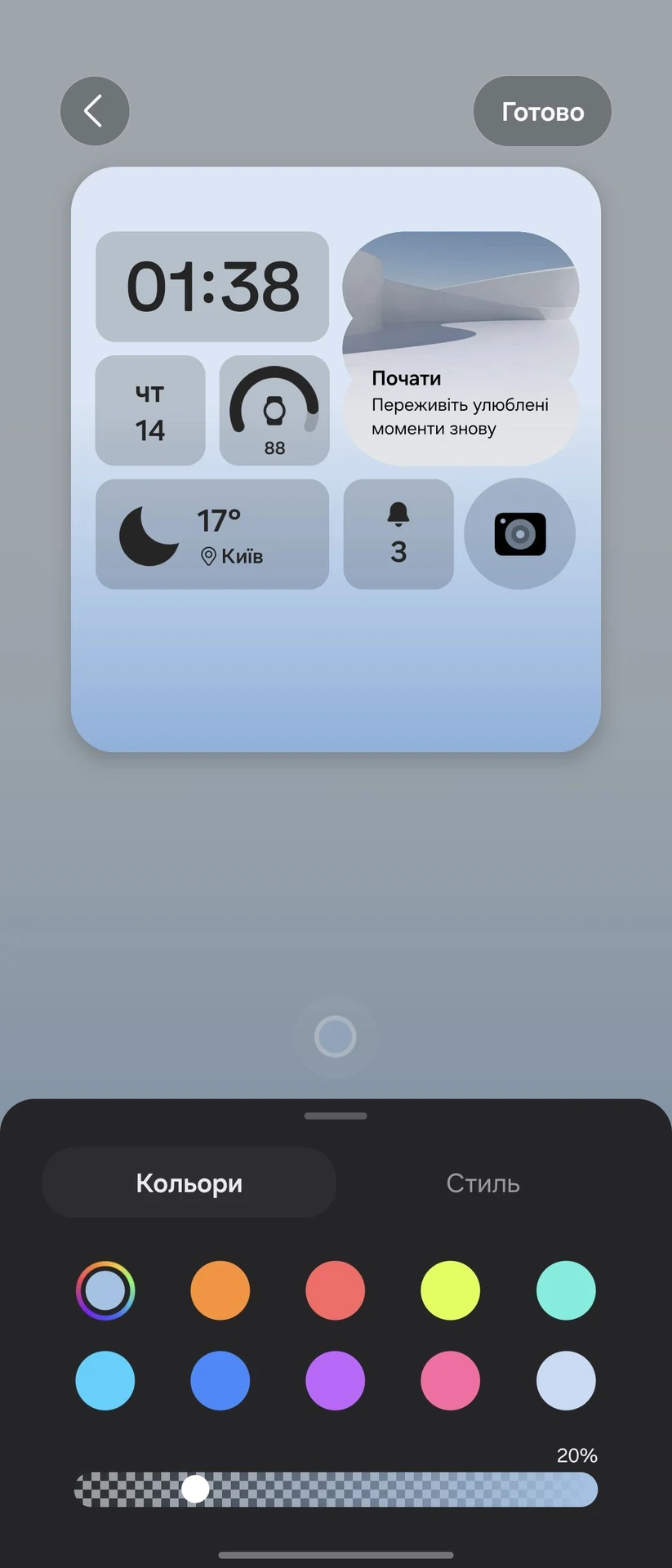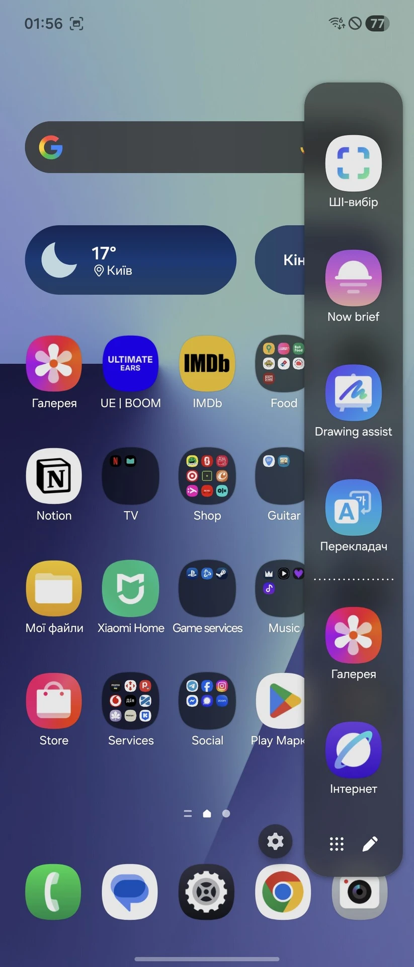 Є готові віджети погоди, календаря, Samsung Health тощо. Також є підримка карт, YouTube, застосунків для повідомлень та дзвінків. Верхня шторка має усі базові перемикачі, але налаштувати її не можна.