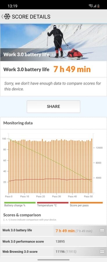 Смартфон отримав акумулятор місткістю 3300 мА-год, що відверто небагато за мірками сучасних флагманських моделей. Проте формат смартфона дозволяє менше звертатися до основного екрана, в той час, як зовнішній використовує менше заряду батареї. Тому на день Galaxy Z Flip3 в цілому вистачає, але якщо дуже активно користуватися апаратом, тоді доведеться заряджати його вже під вечір. Автономність протягом дня підтверджується також синтетичним тестом PC Mark, в якому смартфон з увімкненим екраном з яскравістю 200 кд/м2 та під навантаженням протримався 7 годин 49 хвилин.